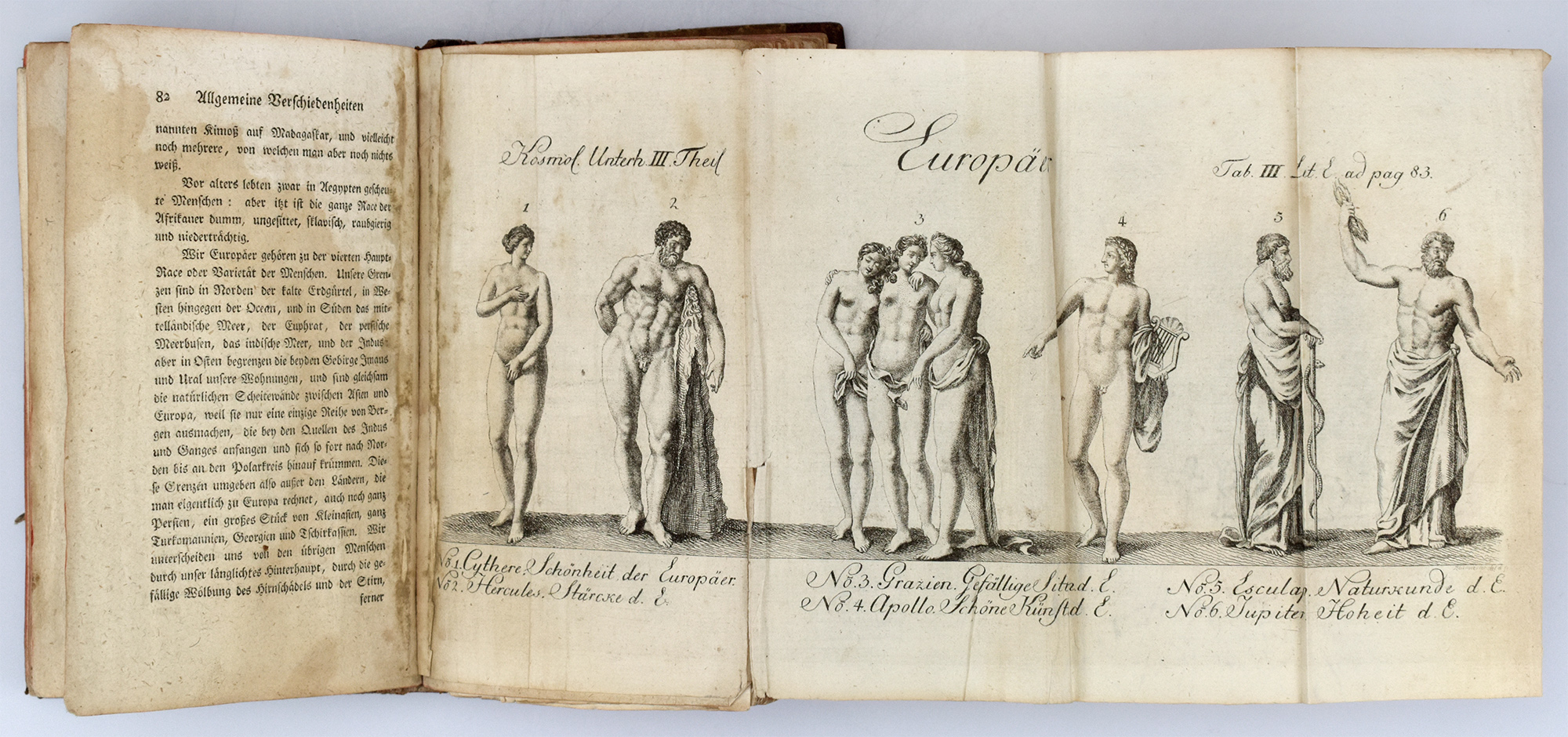 Half leather binding of the time with gilt-tooled spine fillets, gilt spine titles on leather labels, marbled paper-covered boards, and red edges all around. First edition. Reche II, 434. With an engraved title vignette and 20 (of 22) folding copperplate engravings, occasionally coloured or partially coloured. Binding heavily rubbed with a loss and tear to the leather on the spine. Pages and plates lightly darkened, in places with creases, faint foxing, or marginal waterstaining. Several folding plates with tears at the folds (up to 4 cm), plates depicting skulls, European populations, extraordinary individuals, and the circulatory system each with larger tears (6 to 10 cm), the anatomical plate of the skeleton with a cut-out section (approx. 7 × 5.5 cm), the plate depicting American populations with a large loss (figures 1–3 missing), two folding plates loosely inserted. Overall a good copy.