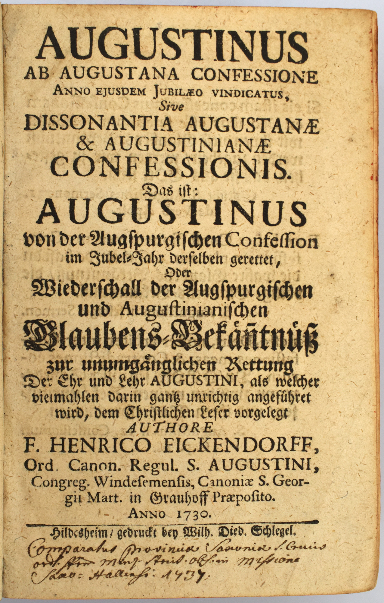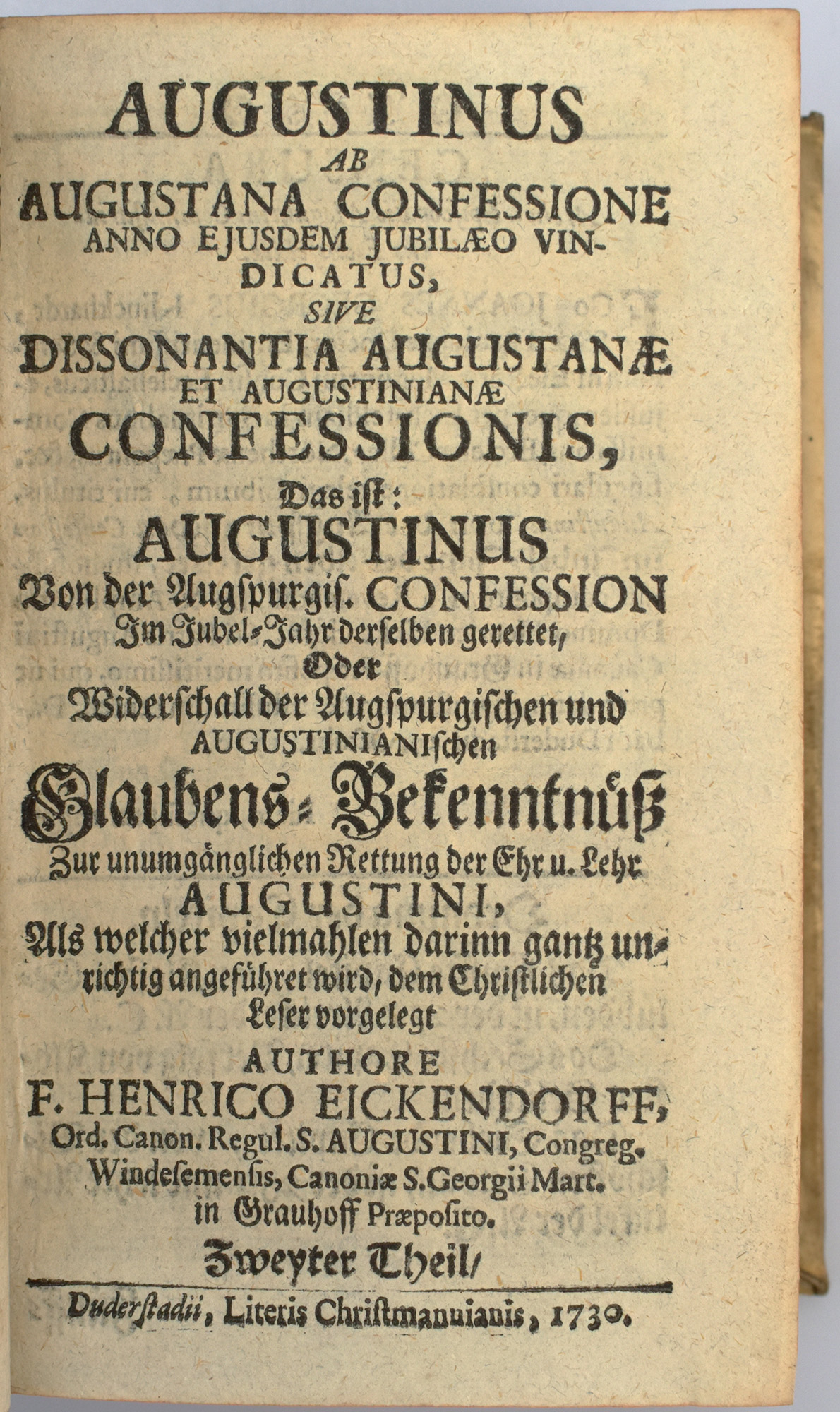 Eickendorff, Heinrich: Augustinus Ab Augustana Confessione Anno Ejusdem Jubilaeo Vindicatus, Sive Dissonantia Augustanae & Augustinianae Confessionis. Das ist: Augustinus von der Augspurgischen Confession im Jubel-Jahr derselben gerettet, Oder Wiederschall der Augspurgischen und Augustinianischen Glaubens-Bekän[n]tnuß zur unumgänglichen Rettung Der Ehr und Lehr Augustini. Erster [und] zweyter Theil. Beigebunden: Lentus Larvatus pro merito castigatus, sive Lustramen Anatomicum. Außerdem beigebunden: Der überall richtig angeführte und der Augspurgischen Convession gerettete Augustinus. 3 Werke (in 4 Teilbänden in 1 Band). Hildesheim, verlegt von Wilhelm Dietrich Schlegel, 1730. Klein-8°. 17 x 11,5 cm. [8] Blatt, 312 Seiten, [1] Blatt, 312 Seiten, [16] Blatt. Pergamentband der Zeit mit blindgeprägtem Rückentitel und rotem Sprengschnitt.
