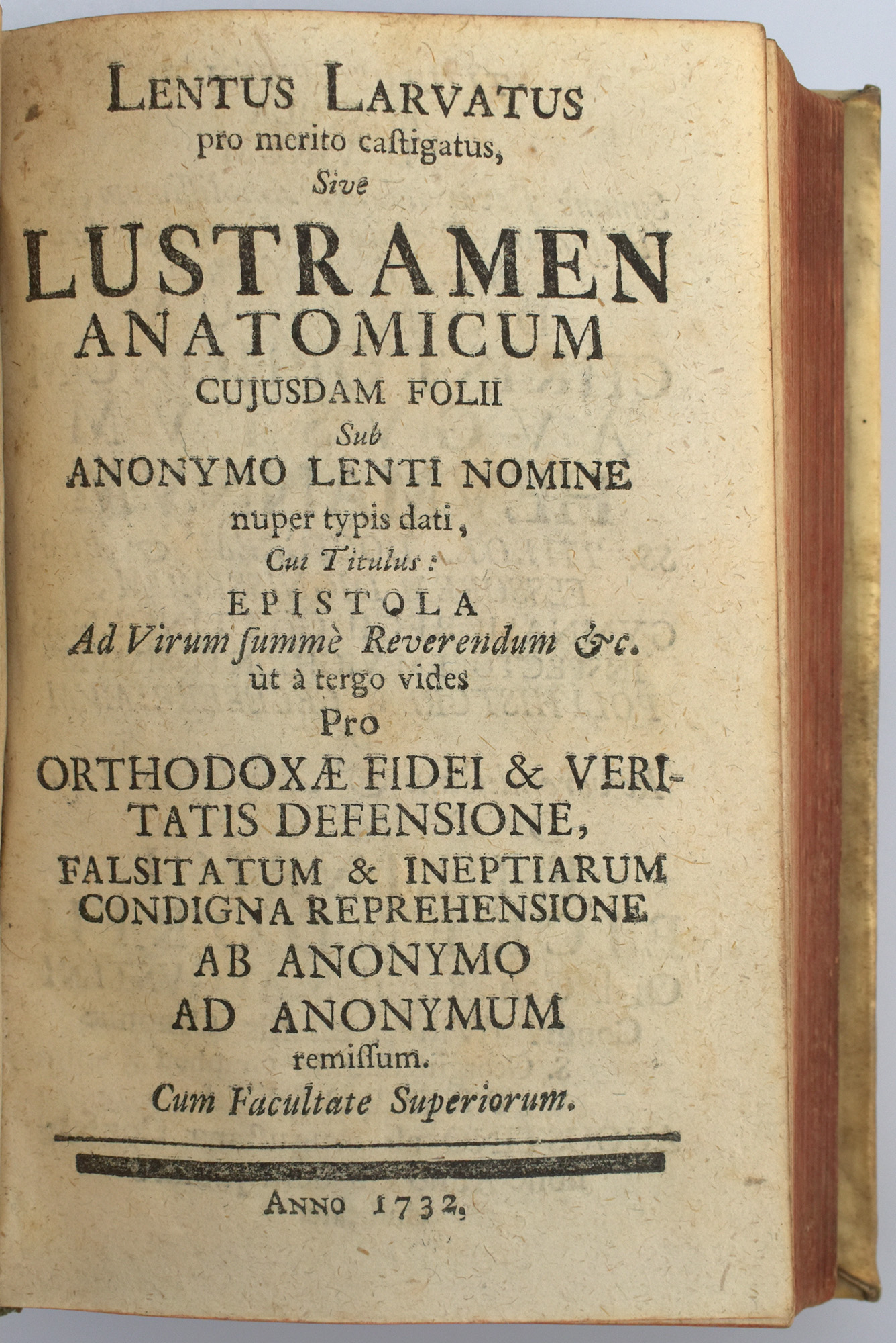 Contemporary vellum binding with blind-stamped spine title and red sprinkled edges. First editions. Texts in German and Latin. Bound with: Lentus Larvatus pro merito castigatus, sive Lustramen Anatomicum. Also bound with: Der überall richtig angeführte und der Augspurgischen Confession gerettete Augustinus. 3 works (in 4 parts, bound in 1 volume). Binding slightly rubbed and mildly stained. Spine with old paper shelfmark label. Pages only slightly toned and occasionally lightly foxed. Near fine copy.