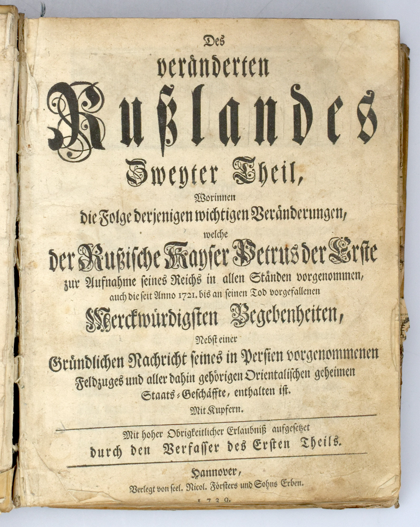 Weber, Friedrich Christian: Des veränderten Rußlandes zweyter [und] dritter Theil. Band 2: Worinnen die Folge derjenigen wichtigen Veränderungen, welche der Rußische Kayser Petrus der Erste zur Aufnahme seines Reichs in allen STänden vorgenommen, auch die seit Anno 1721, bis an seinen Tod vorgefallenen Merckwürdigsten Begebenheiten, nebst einer Gründlichen Nachricht seines in Persien vorgenommenen Feldzuges und aller dahin gehörigen Orientalischen geheimen Staats-Geschäffte, enthalten sind. Band 3: Die Regierung der Kayserin Catharina und des Kaysers Petri Secundi, und sonst alle vorgefallene Merkwürdigkeiten in sich haltend. Beigebunden: Umständliche Nachrichten von Persien. Außerdem beigebunden. Habichsthal: Umständliche Nachricht vom Leben Peter des II. 4 Werke (in 1 Band). Hannover, verlegt duch Nicolai Förster und Sohn (Erben), 1739-1740. [3] Blatt, 247 Seiten, [1] Blatt, 243 Seiten, [5] Blatt.