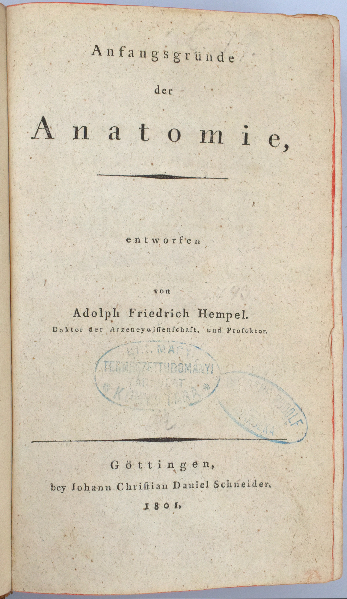 Hempel, Adolph Friedrich: Anfangsgründe der Anatomie des gesunden menschlichen Körpers. [Erste Ausgabe]. Göttingen, Verlag Johann Christian Daniel Schneider, 1801. 8°. 20,5 x 13 cm. XXIV, 878 Seiten. Halblederband der Zeit mit Rückenvergoldung, marmoriertem Deckelbezug, Vorsätzen aus schabloniertem Buntpapier und Rundum-Rotschnitt.