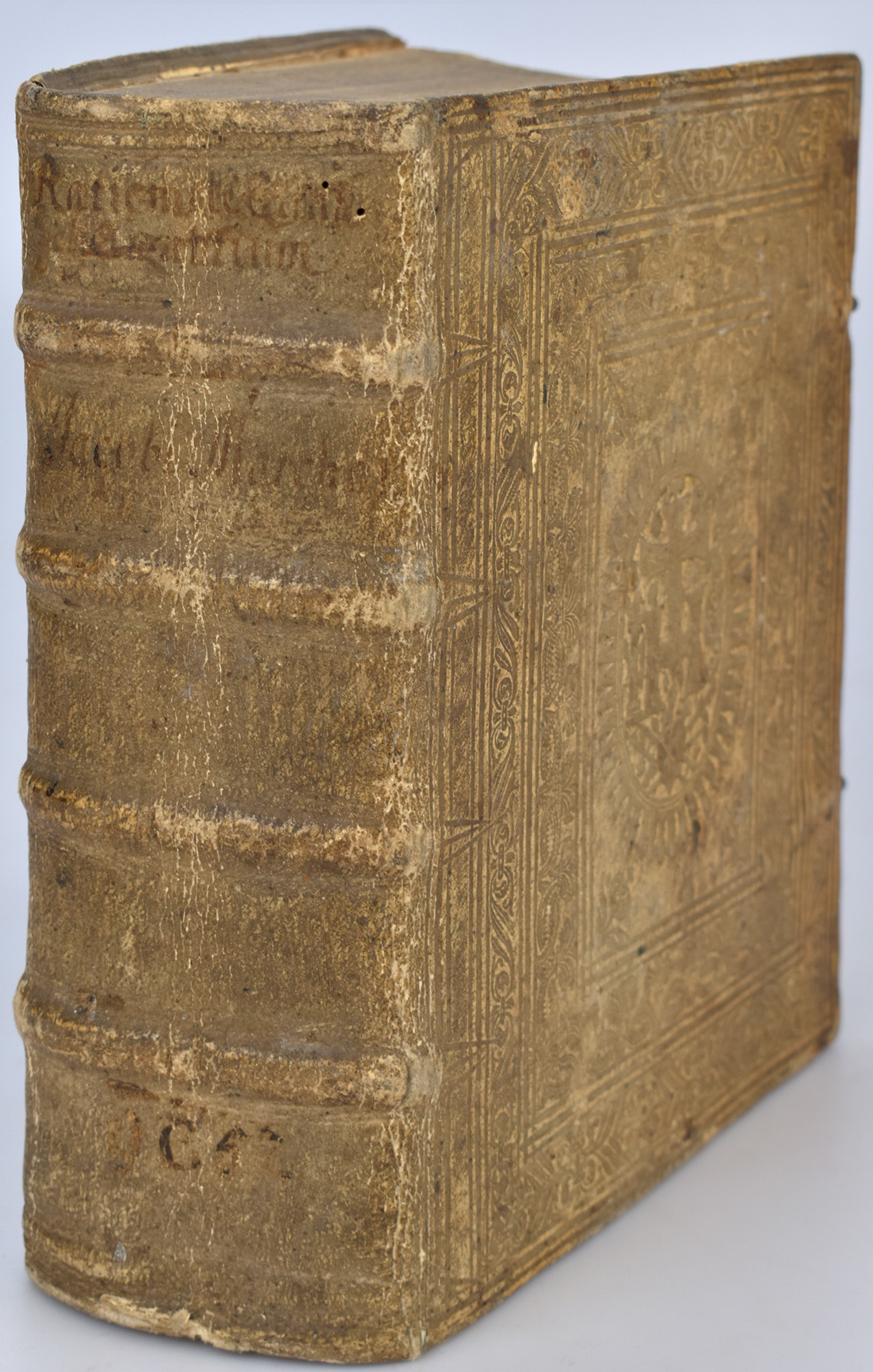 Marchantius, Jacobus: Rationale evangelizantium. Beigebunden: Derselbe: Opuscula pastoralia. [2 Werke in 4 Teilbänden in einem Band]. Coloniae Aggripinae [Köln], gedruckt bei Johannes Henning, 1641/1642. 8°. 21 x 17,5 cm. [5] Blatt, 436 Seiten, [4] Blatt, 387 Seiten, [3] Blatt, [1] Blatt, 424 Aeiten, [4] Blatt, [3] Blatt, 402 Seiten, [2] Blatt. Schweinslederband der Zeit mit reicher Blindprägung auf 4 Bünden.