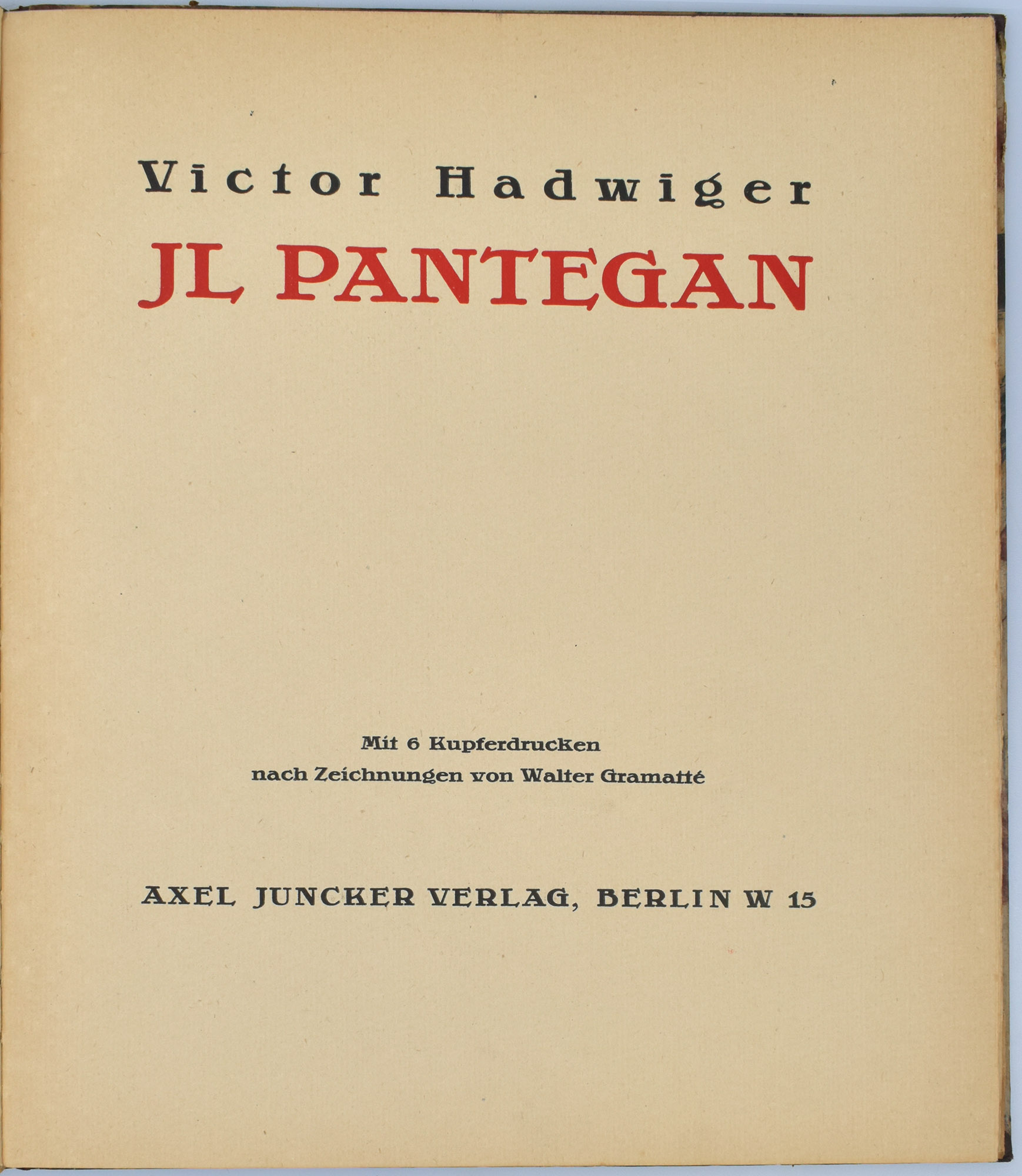 Hadwiger, Viktor: Il Pantegan. Mit 6 Kupferdrucken nach Zeichnungen von Walter Gramatté. [Signierte Ausgabe]. Berlin, Verlag Axel Juncker, 1919. 4°. 28,5 x 25,5 cm. 75 Seiten. Original-Halbleinenband mit goldgeprägtem Rückentitel, Deckelbezug aus lithografiertem Buntpapier, schwarzem Kopfschnitt und rauem Außenschnitt.