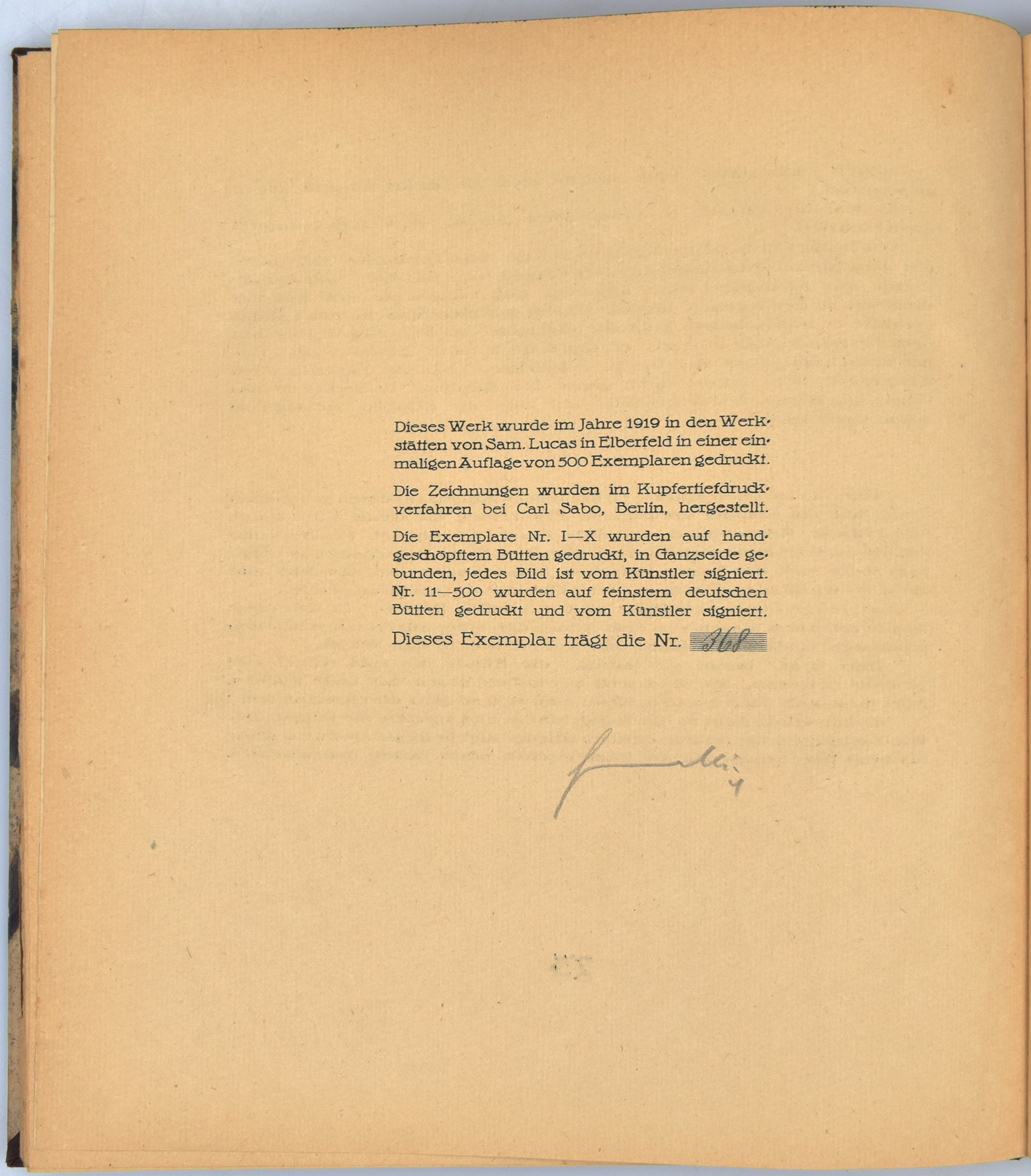 Nummer 368 von 490 von Gramatté im Kolophon in Blei signierten Exemplaren auf Bütten. Raabe 99, 8. Mit rot-schwarz gedrucktem Titel und 6 Tafeln in Kupfertiefdruck nach Zeichnungen von Gramatté, hergestellt bei Carl Sabo, Berlin. Das Werk wurde in den Werkstätten von Sam. Lucas in Elberfeld in einer einmaligen Auflage gedruckt. Einband gering berieben, Seiten leicht gebräunt, ansonsten sehr gutes Exemplar.