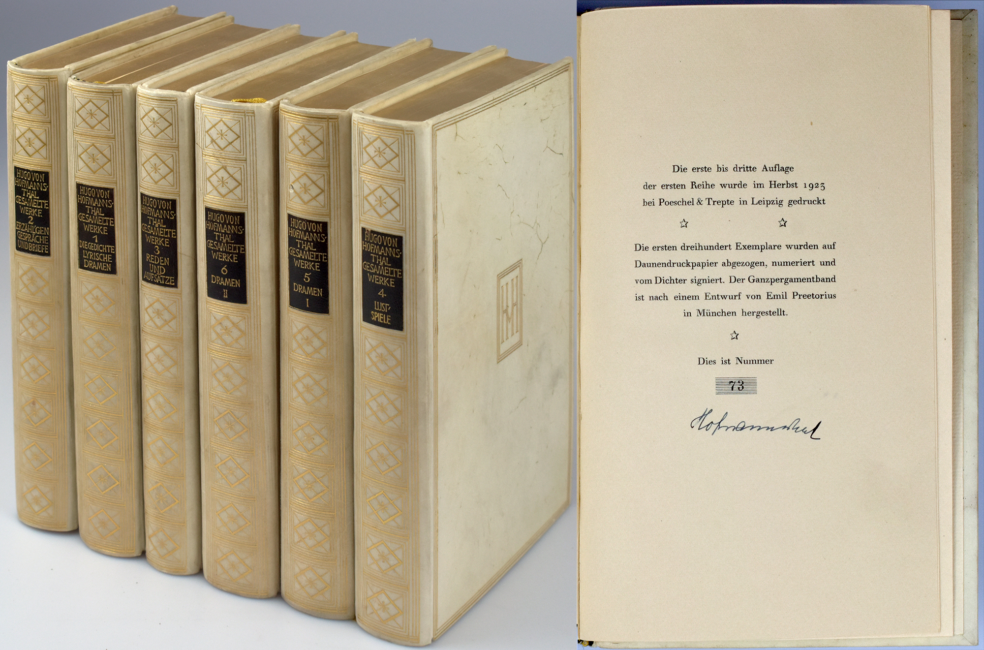 Nummer 73 von 300 Exemplaren der Vorzugsausgabe, im Kolophon in Tinte von Hofmannsthal signiert (Kolophon jeweils nur am Ende der beiden Reihen, also in Band 3 und in Band 6). Wilpert/Gühring 96. The Hoffmannsthal Collection in the Houghton Library 340. Auf Daunendruckpapier abgezogen. Die Einbände sind nach einem Entwurf von Emil Preetorius in München hergestellt worden.
