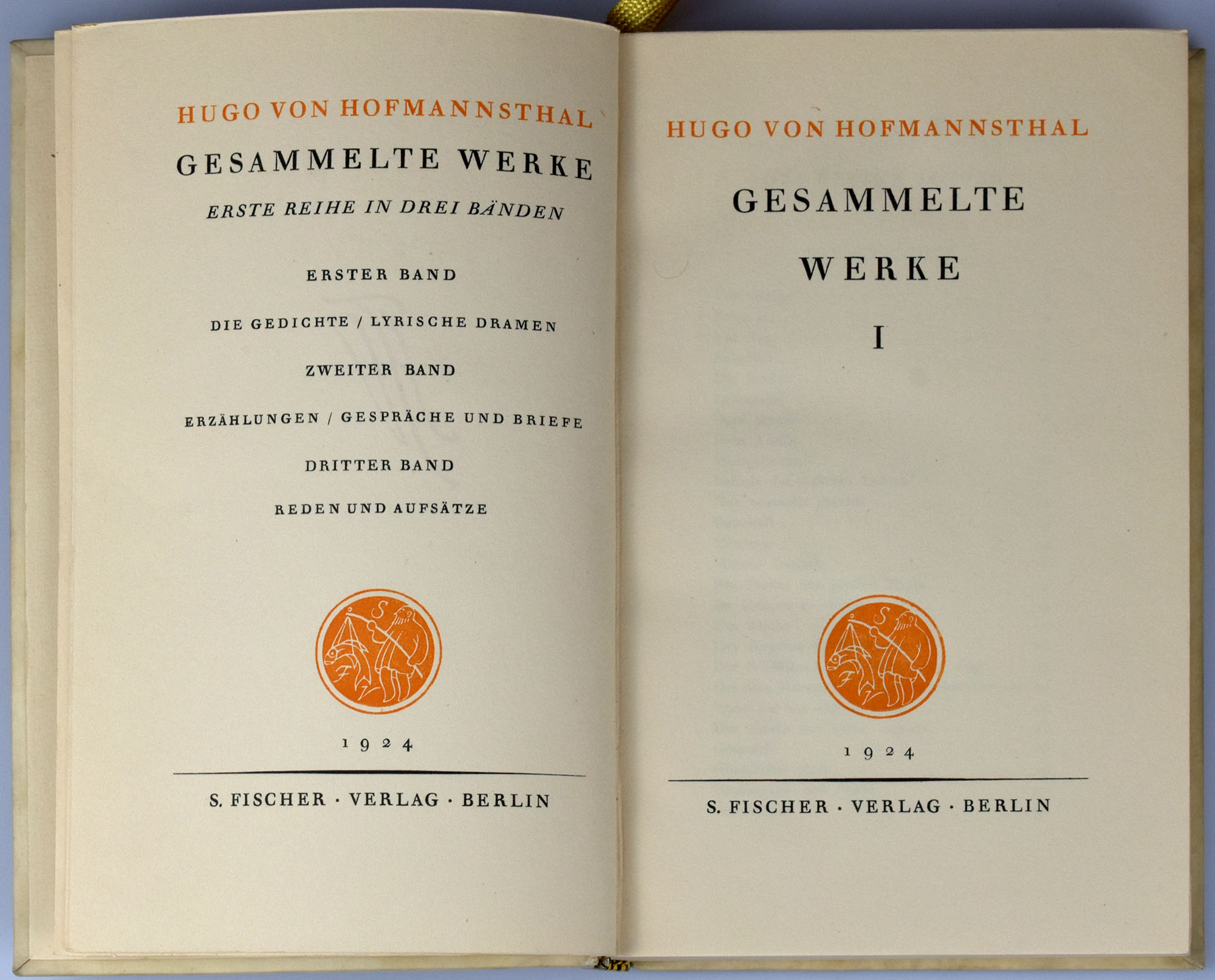 Hofmannsthal, Hugo von: Gesammelte Werke. Erste Reihe in drei Bänden [und] zweite Reihe in drei Bänden. 6 Bände (= komplett). Berlin, S. Fischer Verlag, 1924. 8°. 21 x 13,5 cm. 350; 284; 203; 448; 351; 471 Seiten. Original-Pergamentbände mit Rückenvergoldung, goldgeprägten Titeln auf schwarzen Lederrückenschildern, goldgeprägten Rückenfileten, goldgeprägten Dichterinitialen auf Vorderdeckeln und mit goldenen Kopfschnitten.