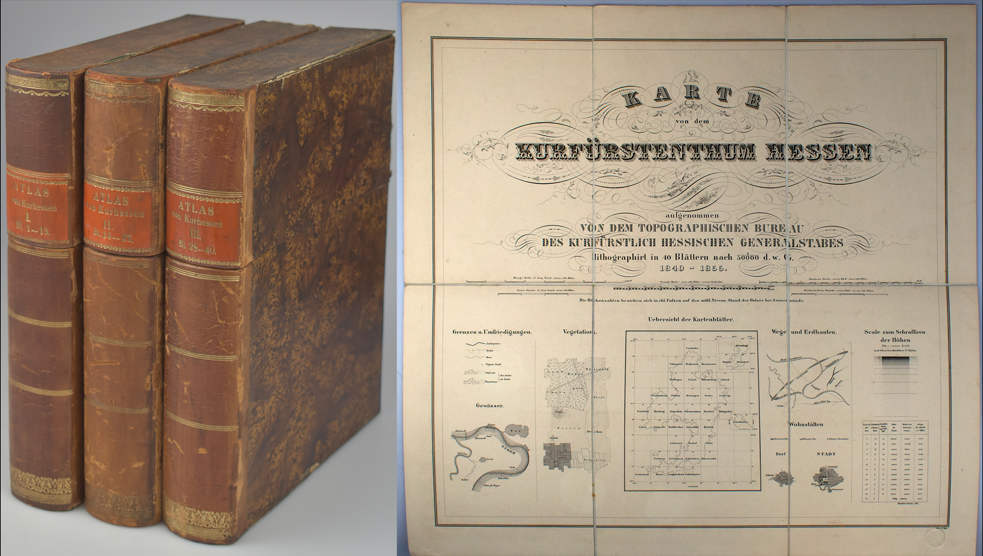 Karte von dem Kurfürstenthum Hessen aufgenommen von dem Topographischen Bureau des Kurfürstlich Hessischen Generalstabes lithographirt in 40 Blättern nach 1/50 000 d. w. G. 1840-1855. [Kassel], Topographisches Bureau d. Kurfürstl. Hess. Generalstabes, 1840-1855 [recte 1857]. Übersichtsblatt und 39 Karten in zweiteiligen, geschlossenen Halbleder-Schubern der Zeit mit goldgeprägten Rückenfileten, goldgeprägtem Titel auf roten Lederrückenschildern und Marmorpapierbezug.