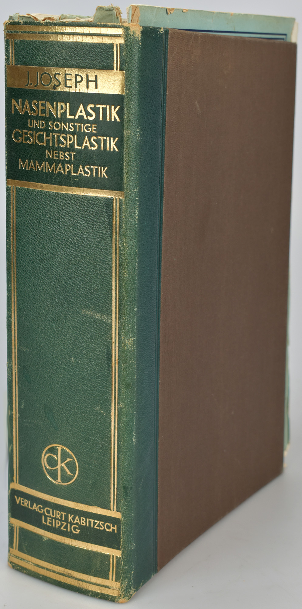 Joseph, Jacques: Nasenplastik und sonstige Gesichtsplastik. Nebst einem Anhang über Mammaplastik und einige weitere Operationen aus dem Gebiete der äußeren Körperplastik. Ein Atlas und Lehrbuch. 3 Abteilungen (= komplett). Leipzig, Verlag Curt Kabitzsch, 1931. 4°. 27 x 19,5 cm. XXXI, 842 Seiten. Original-Broschuren in Original-Halblederchemise mit goldgeprägtem Rückentitel und Leinenbezug.