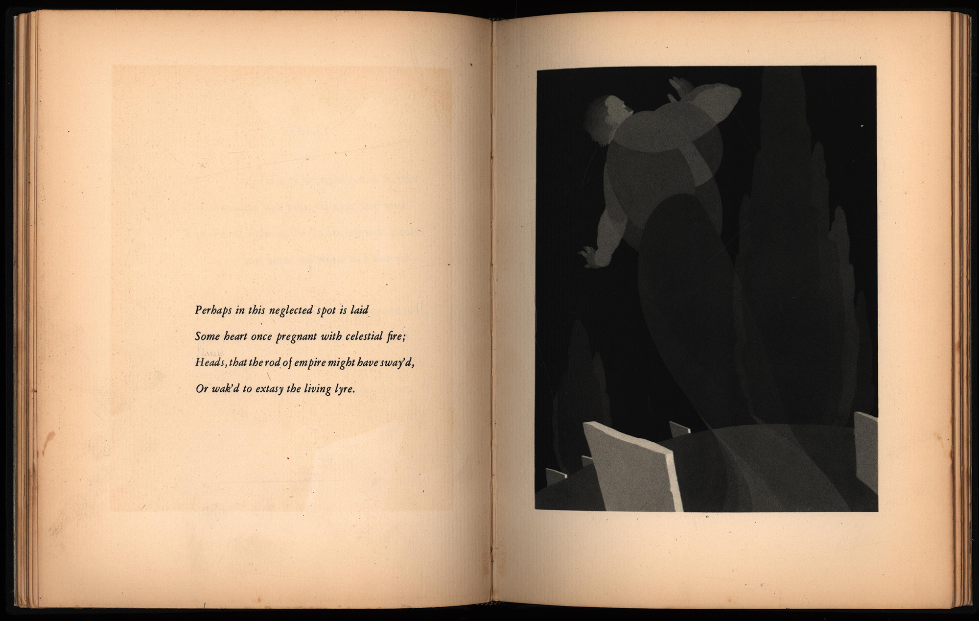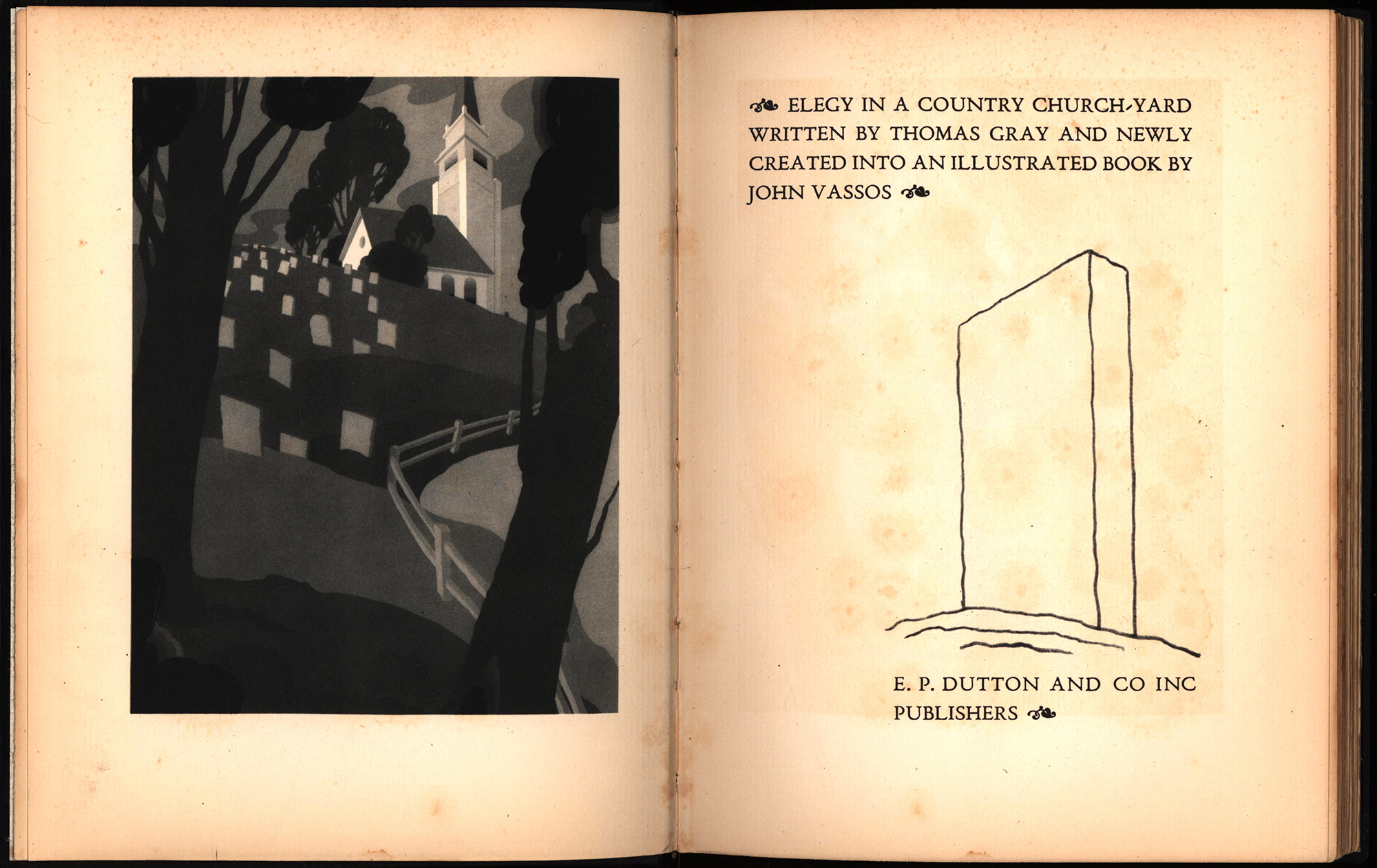 Gray, Thomas – Vassos, John: Elegy in a country church-yard written by Thomas Gray and newly created into an illustrated book by John Vassos. [Handeinband von Gijs Wortel]. New York, Verlag E.P. Dutton, 1931. Groß-8°. 23,5 x 18 cm. 75 Seiten. 18 Tafeln. Handeinband von Gijs Wertel in schwarzem Ganzleder mit grauer Titelprägung und blindgeprägter Deckelillustration im passenden handgearbeiteten Pappschuber mit Lederkanten.
