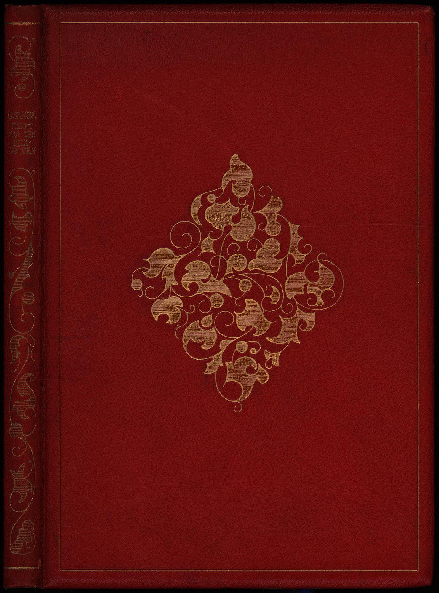 Casanova, Giacomo Girolamo: Die Flucht aus den Bleikammern Venedigs. [Signierte Ausgabe mit Original-Radierungen]. Berlin, Verlag Hans Heinrich Tillgner, 1922. Groß-8°. 26,5 x 18,5 cm. 100 Seiten. Roter Maroquineinband mit floraler Goldprägung. (= Dritter Tillgner-Druck).