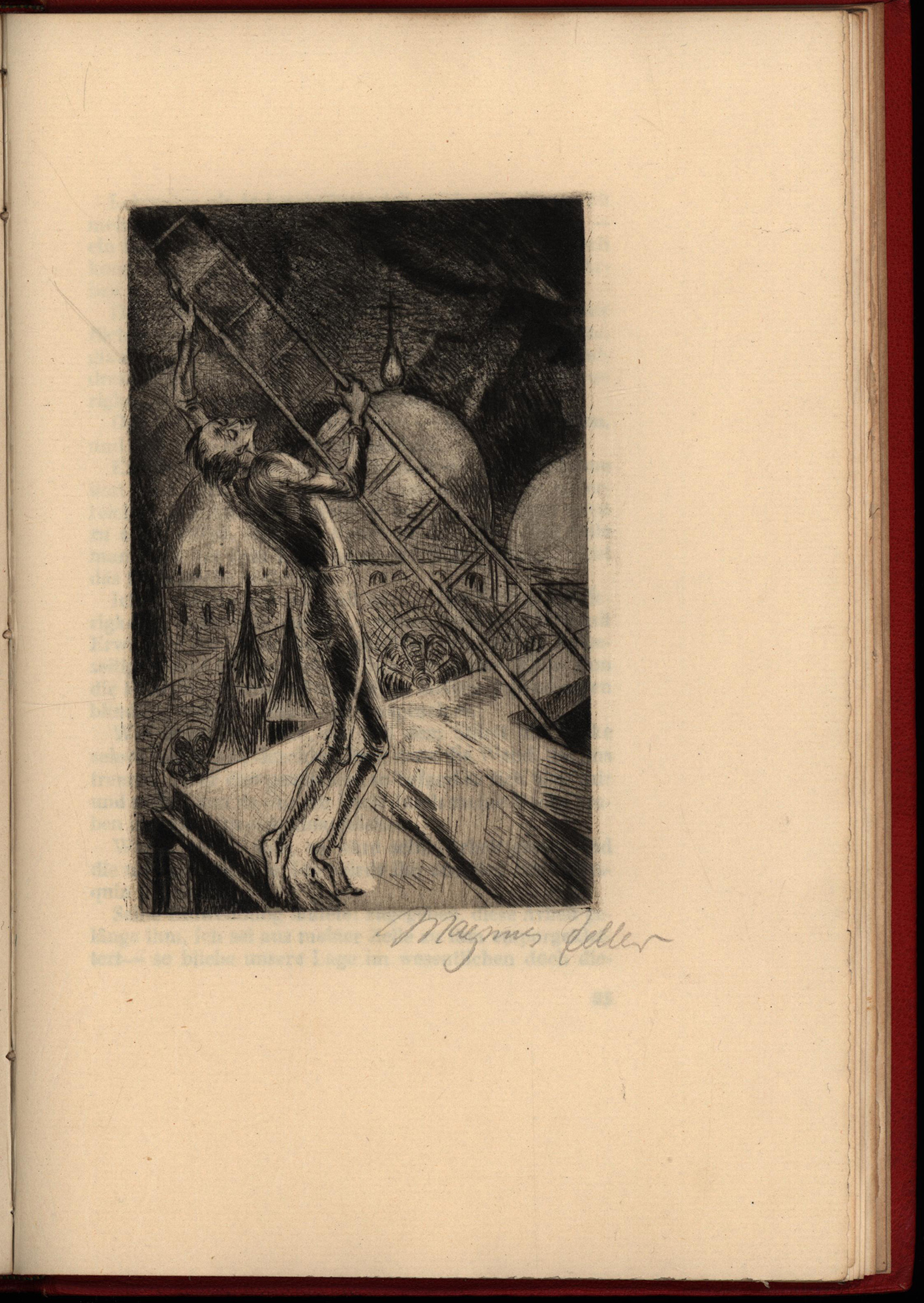 Red morocco binding with floral gilt decoration. Number 74 of 150 numbered copies on hand-made laid paper, with 7 full-page original etchings by Magnus Zeller, all signed in pencil (total edition 500 copies). Rough-cut on two sides. Binding only minimally rubbed. Fine copy.