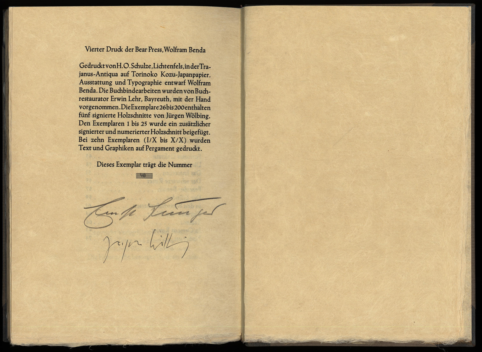 Hand binding in original half leather over 5 raised bands with tooled gilt spine decoration, blue spine title, and light blue top edge. Number 48 of 175 copies with 5 original woodcuts by Jürgen Wölbing (total edition 210). In the present copy the woodcuts are not individually signed, but the colophon is signed in pencil by Ernst Jünger and Jürgen Wölbing. Printed by H. O. Schulze, Lichtenfels, in Trajanus Antiqua on Toriniko Kozu Japan paper. Design and typography by Wolfram Benda. The binding work was carried out by book restorer Erwin Lehr, Bayreuth, by hand. Spine slightly faded, otherwise fine copy.