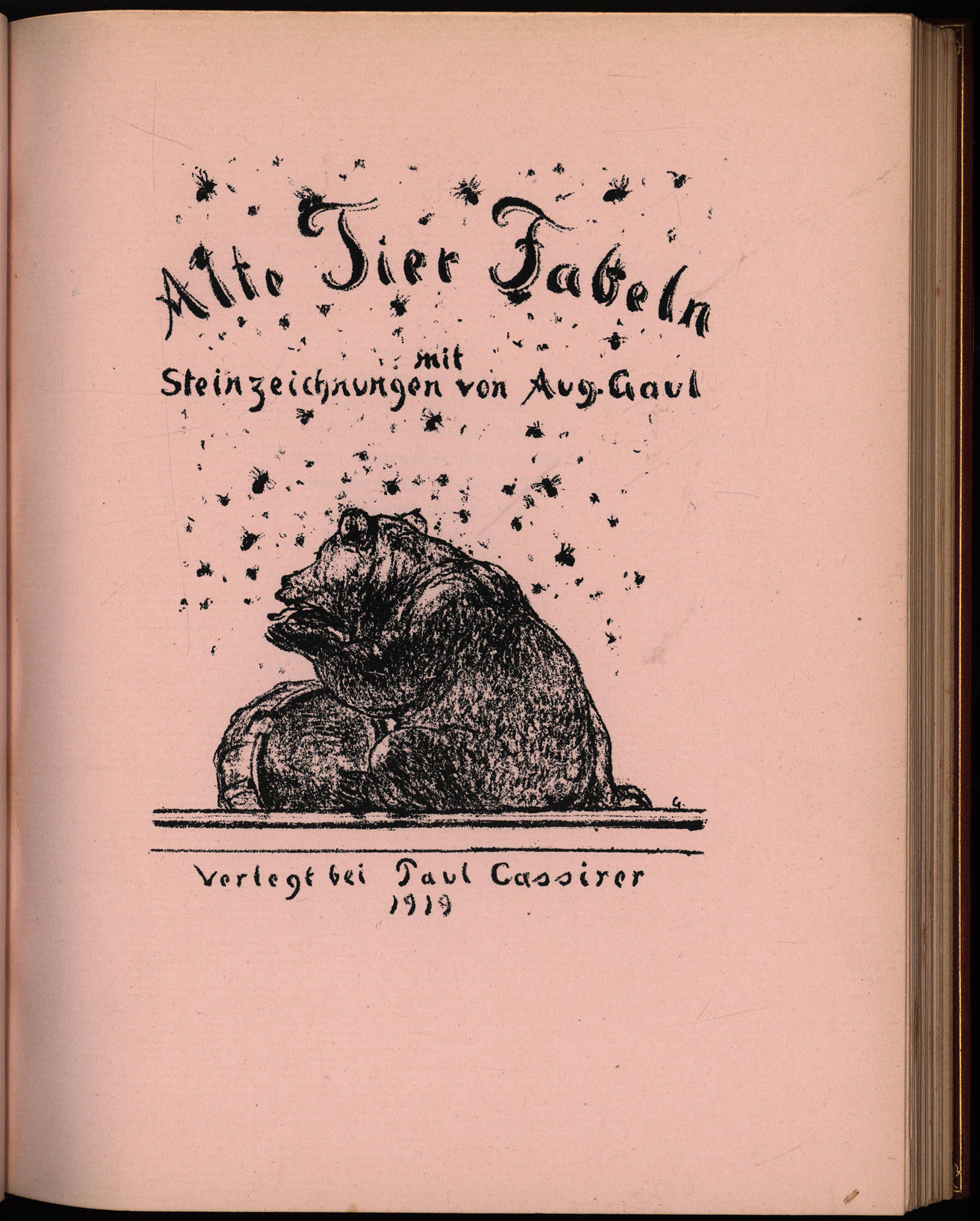 Hand binding by Peter A. Demeter in full brown leather with five raised bands, gilt title on green leather spine label, ornamental gilt spine decoration, gilt fillets on covers and edges, and gilt top edge. First popular edition, this copy with a hand binding by Peter A. Demeter, Hellerau (gilt binder’s stamp on the inner edge of the lower cover). Feilchenfeldt/Brandis 158.1. With 84 lithographs by August Gaul, some full-page. Old animal fables from Karl Wilhelm Ramler’s Fabellese (Leipzig 1783). The text and lithographs in this edition were printed on pink-tinted paper on the lithographic press of M.W. Lassally. Binding somewhat rubbed at edges and bands. One lower corner of the cover with a bump and detached leather piece (appr. 2 cm). Endpapers and blanks somewhat darkened and lightly foxed. Page margins throughout slightly toned, some pages with light foxing. Overall a near fine copy.