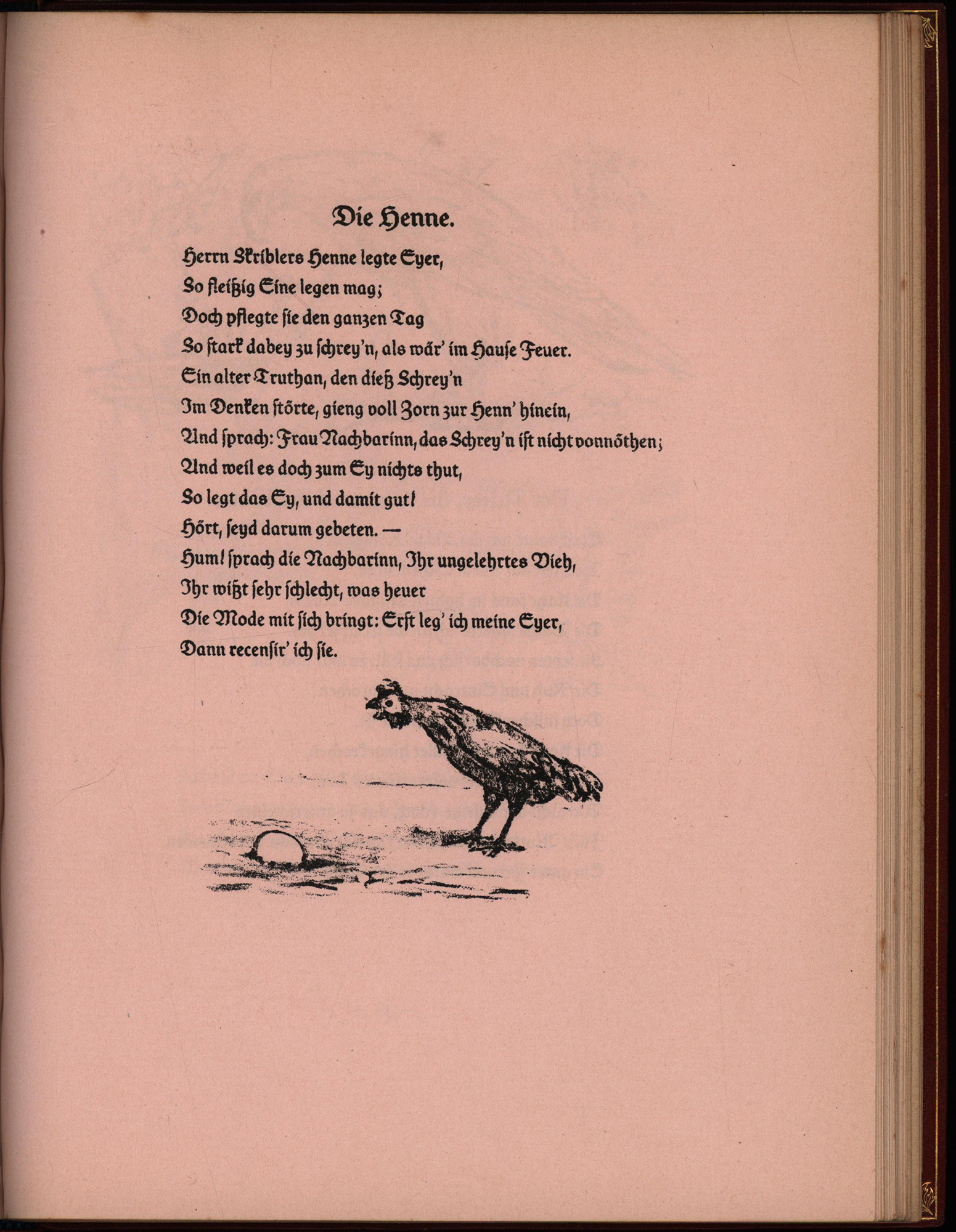 Erste Volksausgabe, dieses Exemplar mit Handeinband von Peter A. Demeter, Hellerau (goldgeprägtes Buchbindersignet auf Innenkante des Hinterdeckels). Feilchenfeldt/Brandis 158.1. Mit 84 zum Teil ganzseitigen Lithografien von August Gaul. Alte Tierfabeln aus Karl Wilhelm Ramlers Fabellese (Leipzig 1783). Der Text und die Lithografien wurden in dieser Ausgabe auf rosa eingefärbtes Papier auf der lithografischen Schnellpresse von M.W. Lassally gedruckt. Einband an Kanten und Bünden stellenweise etwas beschabt. Untere Buchecke mit Stoßstelle mit abgeplatztem Lederbezug (ca. 2 cm). Vorsatzpapier und Vakatblätter etwas gebräunt und gering stockfleckig. Seitenstege durchweg leicht gebräunt, einige Seiten leicht stockfleckig. Insgesamt gutes bis sehr gutes Exemplar.