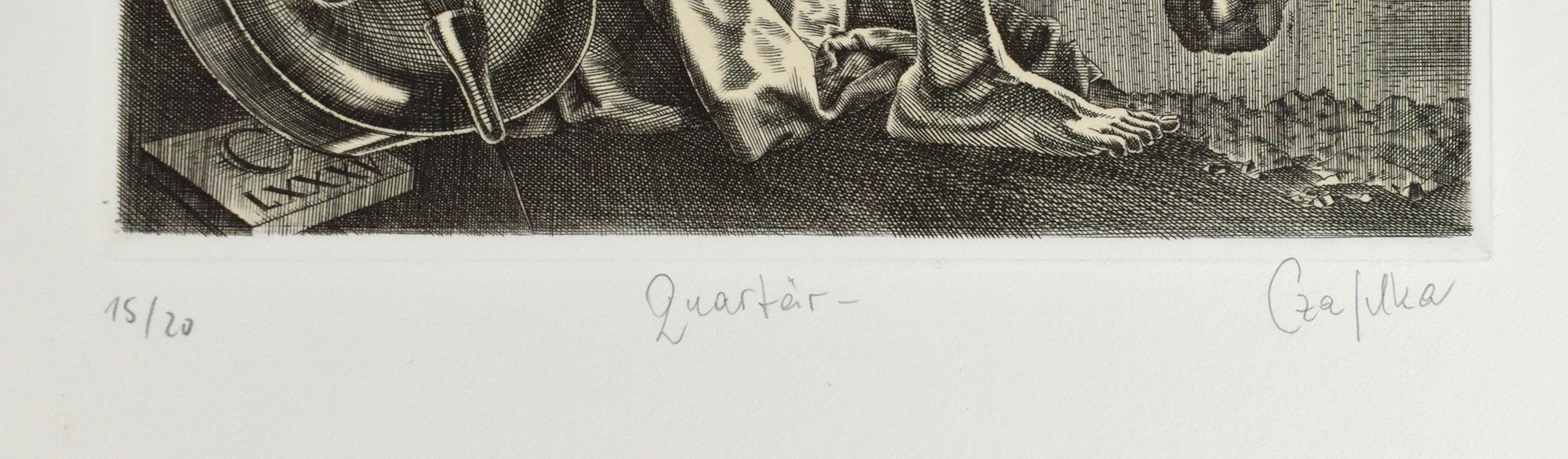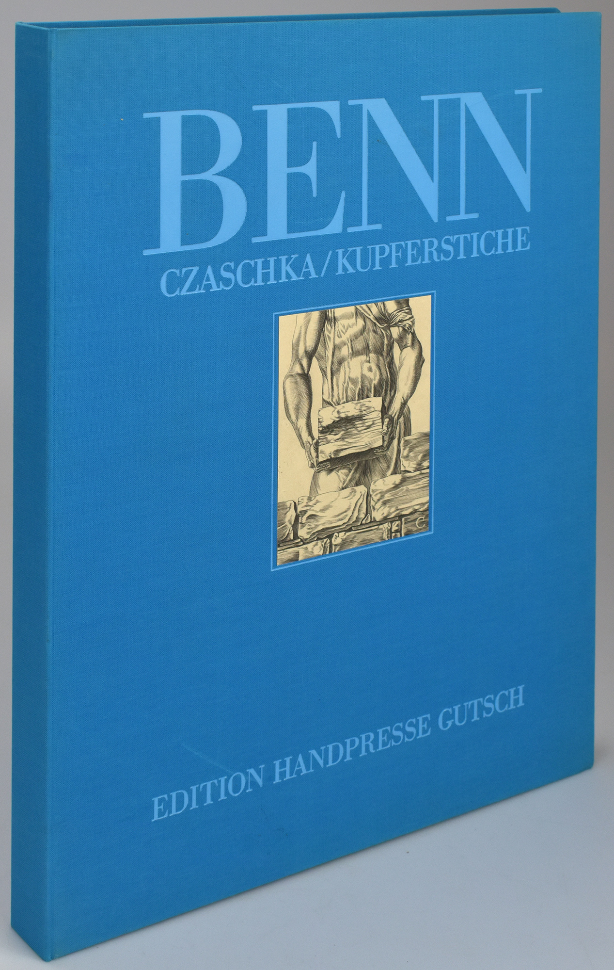 [30] leaves, single-folded, and 10 copper engravings loosely inserted in the original paper folder. Original cloth case with mounted cover illustration. Number 15 of 20 copies numbered in Arabic numerals (total edition: 25 copies). Spindler 103, 18. With 10 original copper engravings by Jürgen Czaschka, each loosely inserted, numbered and signed in pencil by the artist. Leaf size: 39 × 28.5 cm; plate size (plate mark): approx. 19.8 × 15.8 cm. The texts were printed in blue by Herbert Gutsch on a FAG proof press in 12- and 16-point Bodoni Antiqua Roman. The engravings were printed by Jürgen Czaschka on 250 g Zerkall handmade copperplate paper, ivory rough. Bookbinding by Christian Klünder, Berlin. Case minimally rubbed with a few small spots. Fine copy.