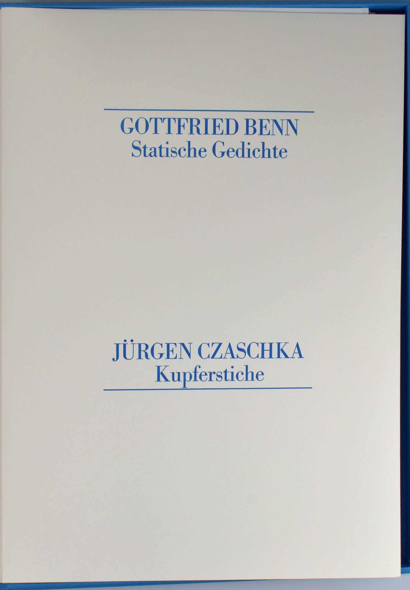 Benn, Gottfried: Statische Gedichte. Jürgen Czaschka, Kupferstiche. [Mit signierten Original-Kupferstichen]. Berlin, Handpresse Gutsch, 1987. 2°. 42 x 30,5 cm. [30] Blatt als einfach gefaltete Bögen und 10 Kupfertafeln lose eingelegt in Original-Papierumschlag. Original-Leinenkassette mit montierter Deckelabbildung.