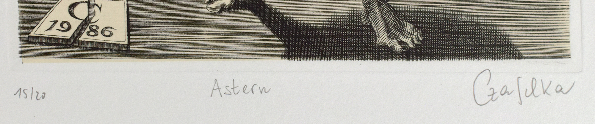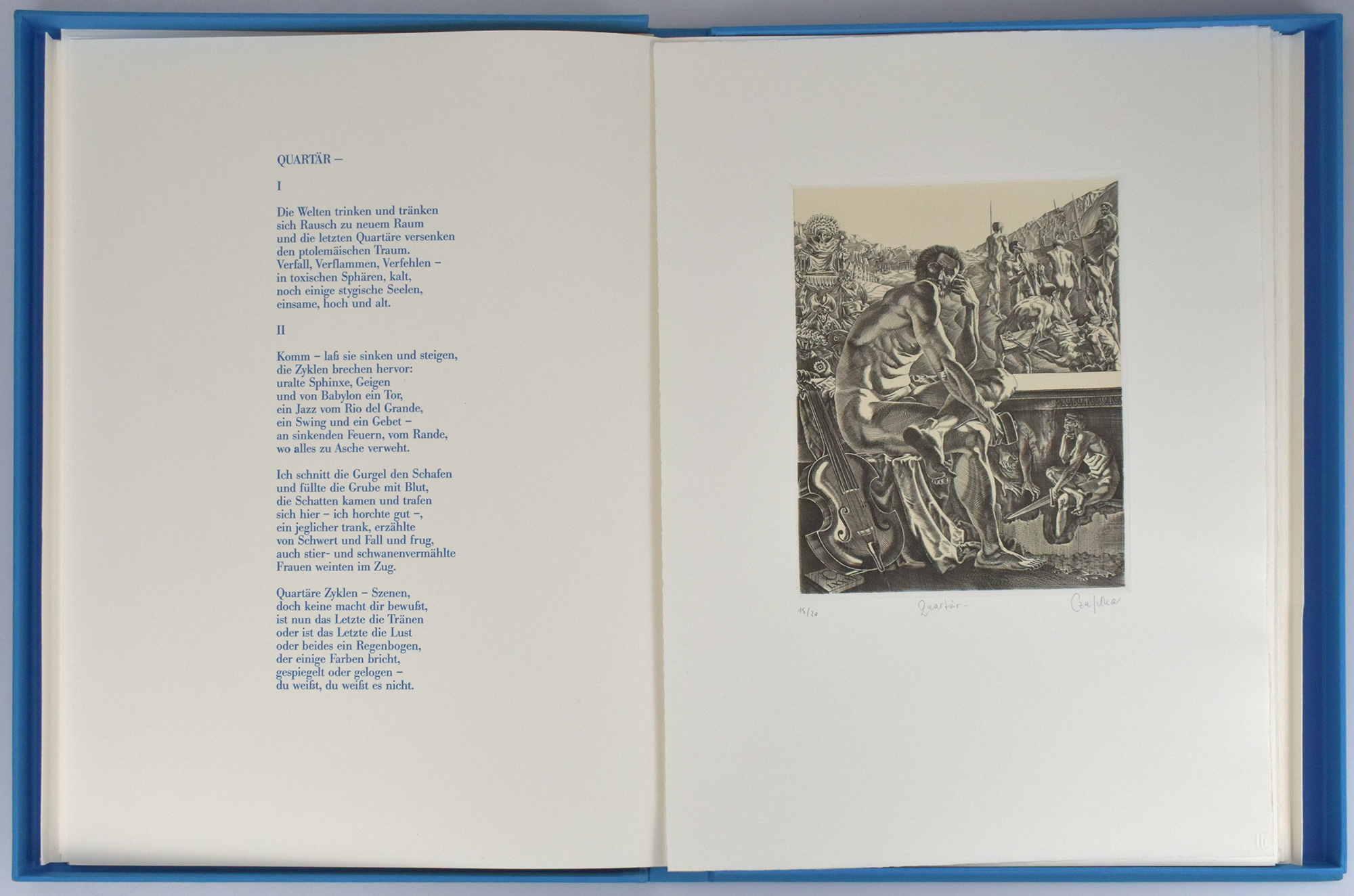 Nummer 15 von 20 arabisch nummerierten Exemplaren (Gesamtauflage: 25 Exemplare). Spindler 103, 18. Mit 10 lose beigelegten Original-Kupferstichen von Jürgen Czaschka, jeweils in Blei vom Künstler nummeriert und signiert. Blattmaße: 39 x 28,5 cm, Grafikmaße (Plattenrand): ca. 19,8 x 15,8 cm. Druck der Texte in Blau durch Herbert Gutsch auf einer FAG-Andruckpresse in der 12 bzw. 16 Punkt Bodoni-Antiqua normal. Die Kupferstiche wurden von Jürgen Czaschka auf 250g Zerkall Bütten-Kupferdruck elfenbein rauh gedruckt. Die Buchbindearbeiten übernahm Christian Klünder, Berlin. Kassette minimal berieben bzw. mit einzelnen kleinen Fleckchen. Sehr gutes Exemplar.
