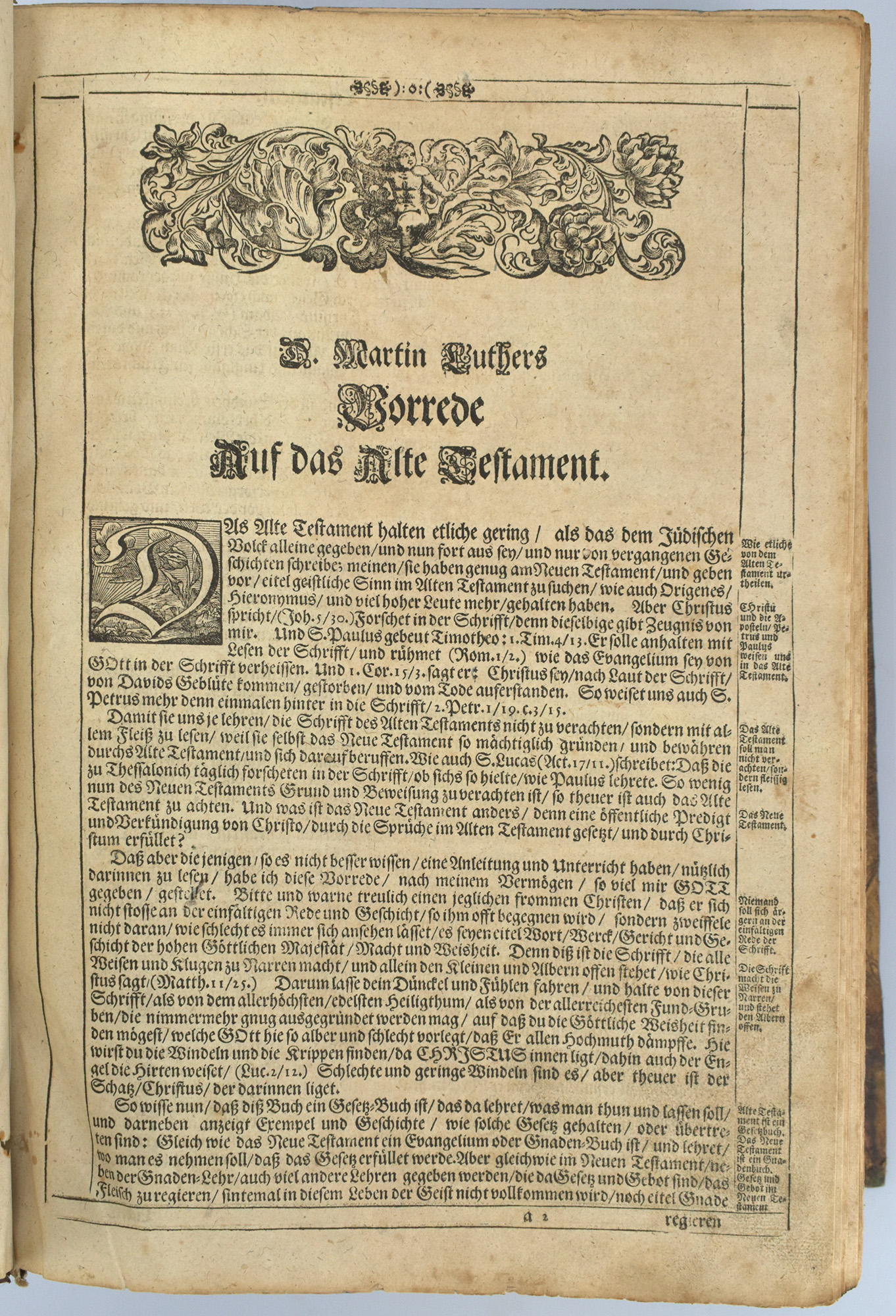 Luther, Martin: Biblia, Das ist: Die gantze Heilige Schrifft, deß Alten und Neuen Testaments wie solche von Herrn Doctor Martin Luther Seel. Im Jahr Christi 1522. in unsere Deutsche Mutter-Sprach zu übersetzen angefangen, Anno 1534. zu End gebracht, und Vor einigen Jahren bereits Mit den Summarien Herrn Johann Sauberti Seel. auch mit dem Vielfältigen und Lehrreichen Nutzen, über alle Capitel, des Herrn D. Salomon Glassens Seel. ausgefertiget. Nürnberg, verlegt durch Johann Andreas Endter, 1706. Groß-4°. 38 x 26 cm. [30] Blatt, 1227 Seiten, [10] Blatt. Blindgeprägter Schweinslederband der Zeit über Holzdeckeln auf 5 Bünden mit Rundum-Blauschnitt.