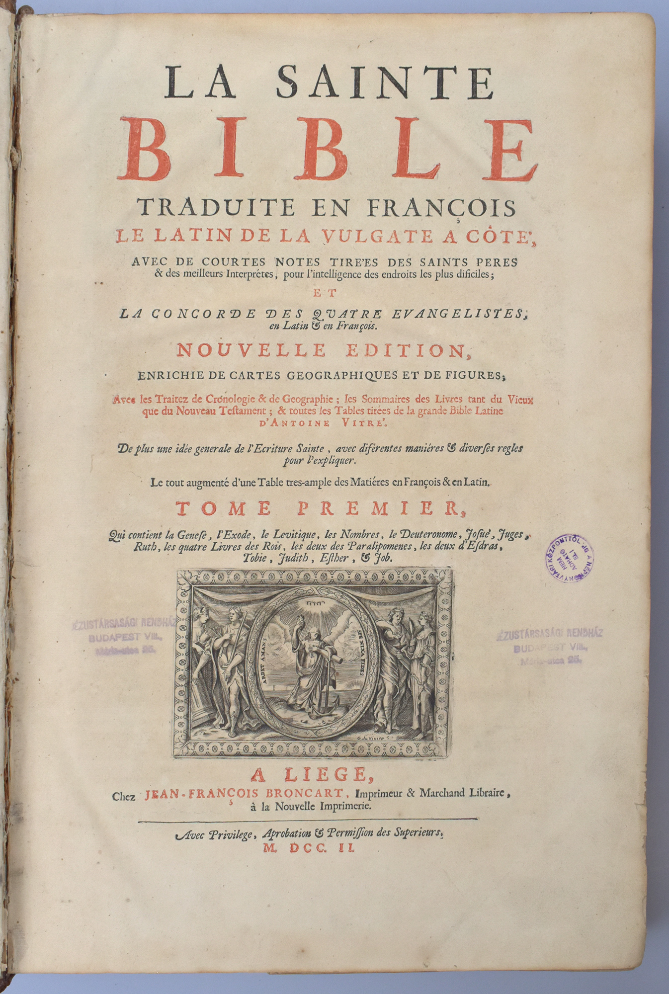 Neue, überarbeitete und erweiterte Ausgabe nach der Sacy-Bibel. Zweisprachige Ausgabe in Französisch und Latein (Parallelausgabe). Mit gestochenem Frontispiz, gestochener Titelvignette, 3 gestochenen Faltkarten, einem gestochenen Faltplan (Jerusalem), einer gestochenen Falttafel, gestochenen figürlichen Kopfvignetten und Initialen.