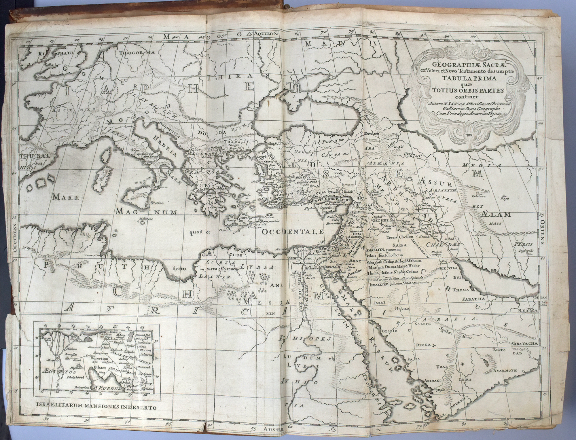 Frontispiz, Vignetten und Initialen wurden gefertigt durch Guillaume du Vivier [Jean Duvivier]. Einbände etwas fleckig, bestoßen stellenweise mit Fehlstellen im Lederbezug. Außengelenke zum Teil eingerissen. Vorsätze etwas leimschattig und mit altem Exlibris. Titelblätter und Vorsätze mit blauen Stempeln späterer Zeit der Jézus Szíve Jezsuita Templom (Herz-Jesu-Jesuitenkirche) in Budapest. Seiten nur gering gebräunt und stellenweise leicht stockfleckig bzw. mit leicht nachgedunkeltem Wasserfleck in den Stegen (ohne Textberührung, nicht wellig), stellenweise etwas knickspurig. Paginierung zum Teil springend. Karte von Jerusalem mit Randeinriss ohne Bildberührung und hinterlegtem Einriss mit Bildberührung (ca. 3 cm ins Bild hineinragend). Weltkarte lose beiliegend, mit kleinen Randläsuren und kleineren Randeinrissen (davon der größte ca. 3 cm in den Bildteil hineinreichend, ansonsten zumeist ohne Bildberührung). Insgesamt gutes bis sehr gutes Exemplar.