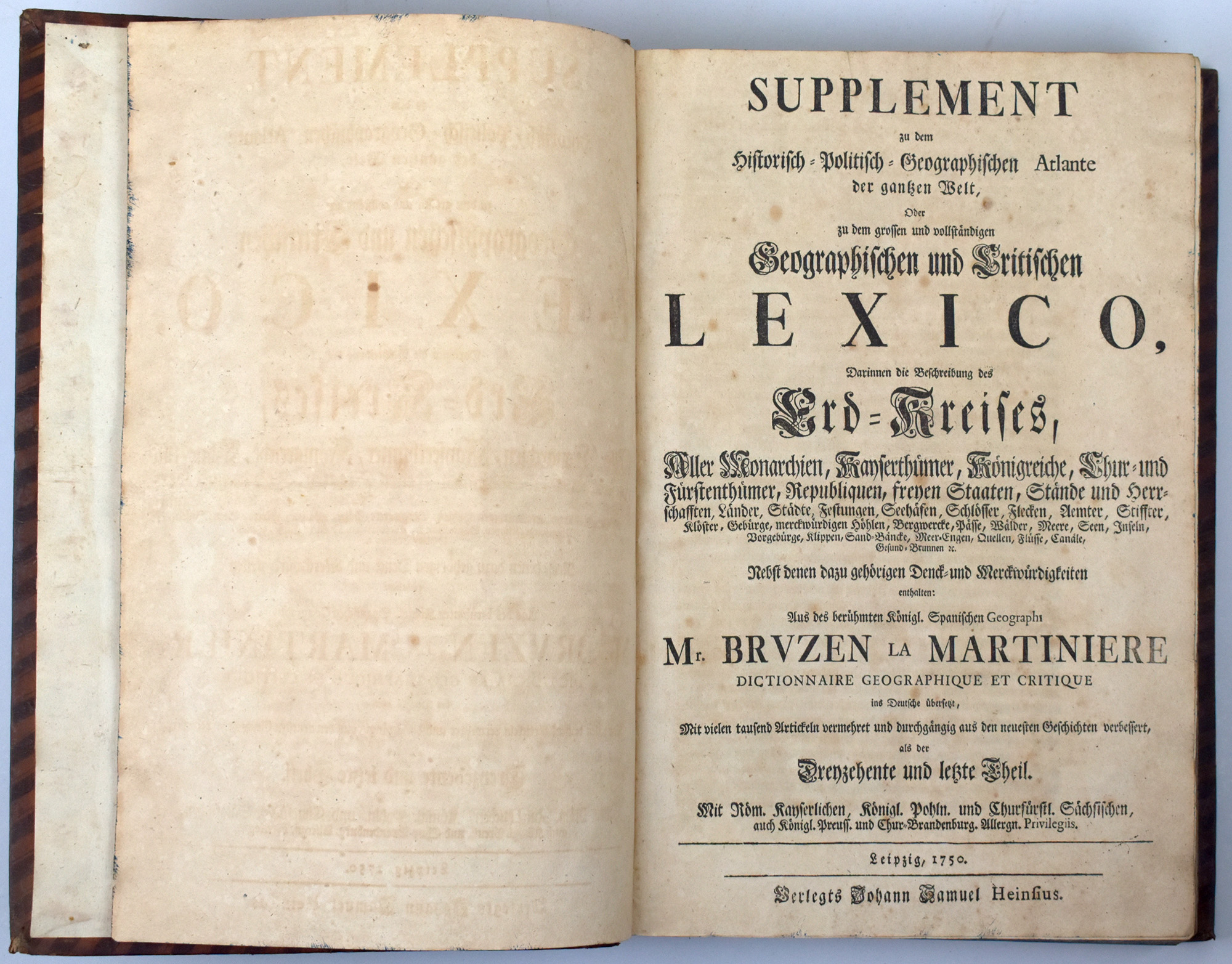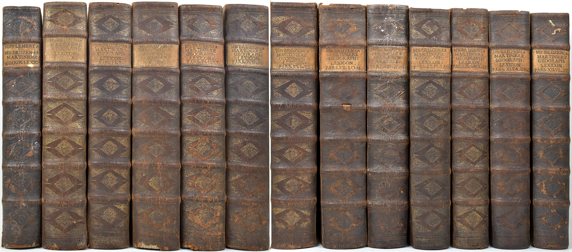 Bruzen de La Martinière, Antoine Augustin: Historisch-politisch-geographischer Atlas der gantzen Welt oder grosses und vollständiges geographisch- und critisches Lexicon. Darinnen die Beschreibung des Erd-Kreises, aller Monarchien, Kayserthümer, Königreiche, Chur- und Fürstenthümer, Republiquen, freyen Staaten, Stände und Herrschafften, Länder, Städte […] nebst denen dazu gehörigen Denck- und Merckwürdigkeiten enthalten. Aus des berühmten Königl. Spannischen Geographi Mr. Bruzen la Martinière Dictionnaire géographique et critique ins Deutsche übers. Mit vielen tausend Artickeln vermehret und durchgängig aus den neuesten Geschichten verbessert 13 Bände (12 Hauptbände und Supplementband, komplett). Leipzig, verlegt durch Johann Samuel Heinsius, 1744-1750. 2°. 40,5 x 27,5 cm. [12], XX Blatt, 1903 Spalten; [8] Blatt, 1983 Spalten; [6] Blatt, 2144 Spalten; [6] Blatt, 2008 Spalten; [6] Blatt, 1960 Spalten; [4] Blatt, 2080 Spalten; [6] Blatt, 2166 Spalten; [4] Blatt, 1984 Spalten; [8] Blatt, 1960 Spalten; [4] Blatt, 1744 Spalten; [4] Blatt, 1934 Spalten; [8] Blatt, 1816 Spalten; [4] Blatt, 1824 Spalten. Lederbände der Zeit auf 6 Bünden mit ornamentaler Rückenvergoldung, schwarzgeprägten Rückentiteln und blauen Sprengschnitten.