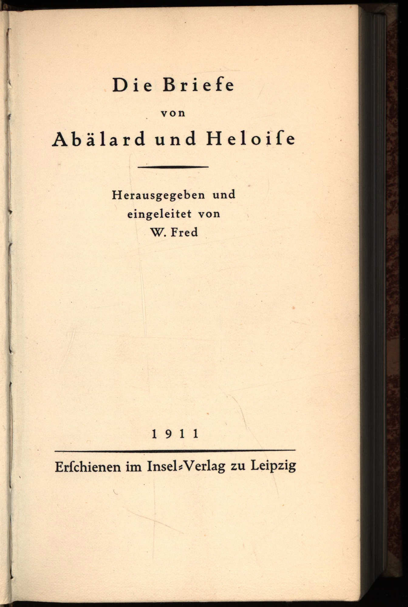 Abaelard, Peter: Die Briefe von Abälard und Heloise. Leipzig, Insel Verlag, 1911. 8°. 20 x 11,5 cm. 311 Seiten. Privater Halbpergamentband der Zeit mit goldgeprägtem Rückentitel, marmoriertem Deckelbezug und grauem Kopfschnitt.