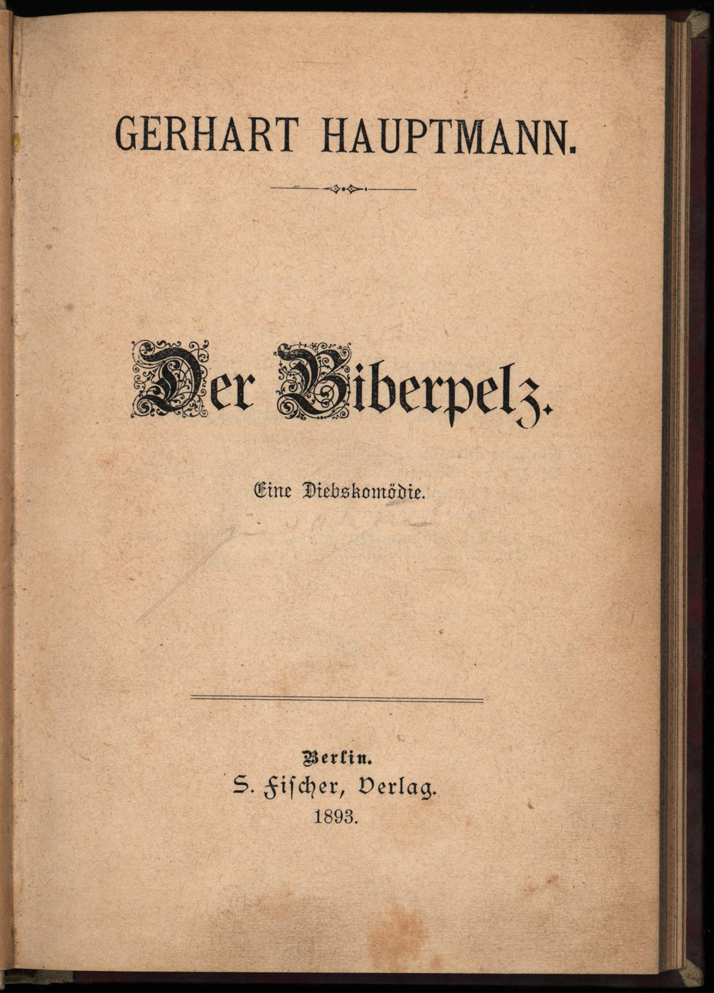 Hauptmann, Gerhart: Der Biberpelz. Eine Diebeskomödie. [Erste Ausgabe]. Berlin, S. Fischer Verlag, 1893. Klein-8°. 18 x 13 cm. 357 Seiten. Original-Pappband mit marmoriertem Bezugspapier, goldgeprägtem Rückentitel auf schwarzem Lederschildchen und mit blauem Sprengschnitt.