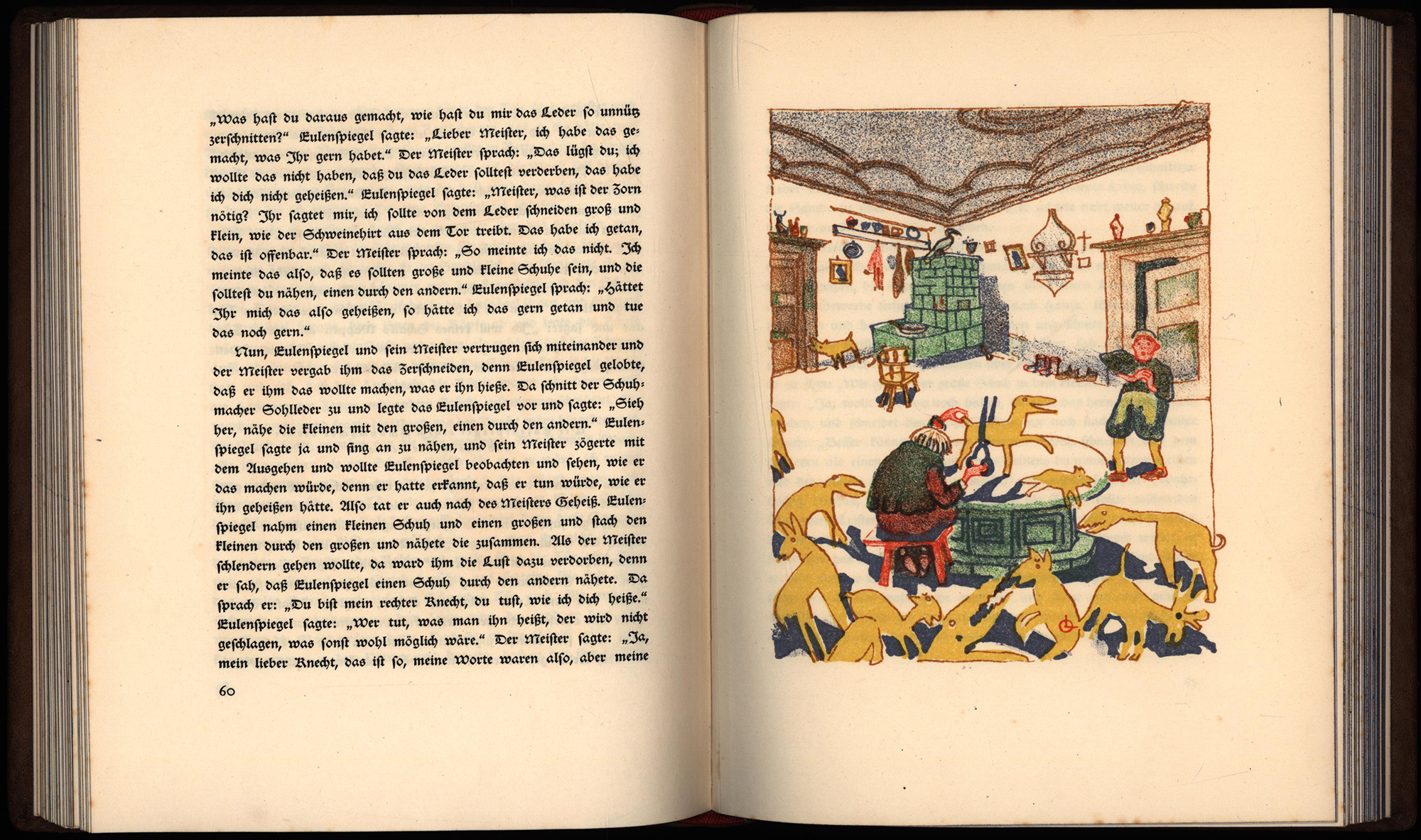 Fleischer, Victor – Laske, Oskar: Till Eulenspiegel. Dem Volksbuch nacherzählt. Mit 24 Originallithographien und 31 Schwarzweißzeichnungen von Oskar Laske. [Signierte Vorzugsausgabe]. Wien, Kunstverlag A. Schroll & Co., 1920. Groß-8°. 23 x 18 cm. 138 Seiten. 24 Tafeln. Lederband auf 4 Zierbünden mit blindgeprägtem Rückentitel, blindgeprägter Deckelillustration und Rundum-Blauschnitt.