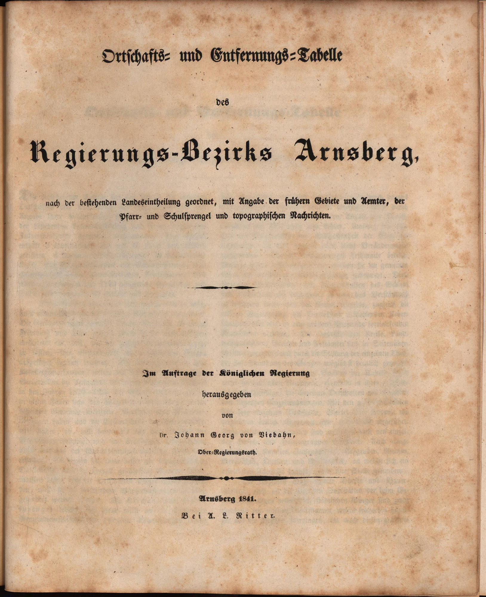 Viebahn, Johann Georg von: Ortschafts- und Entfernungs-Tabelle des Regierungsbezirks Arnsberg. Arnsberg, Verlag Ritter, 1841. 4°. 26 x 22,5 cm. [1] Blatt, 196 Seiten. Marmorierter Pappband der Zeit.