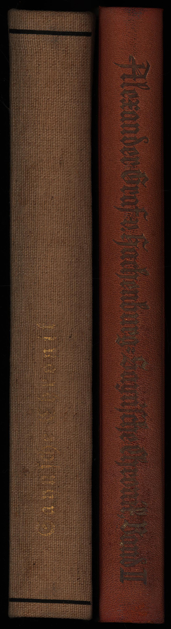 Nummer 89 von 300 Exemplaren (Band 1) und Nummer 26 von 100 Exemplaren (Band 2) der Gesamtauflage. Jeweils im Kolophon von Alexander von Hachenburg signiert, Band 2 zusätzlich unter als Frontispiz montierter Fotografie desselben noch einmal in Tinte signiert. Einbände etwas stockfleckig, Rücken von Band 2 aufgehellt. Mit zahlreichen Abbildungen, zumeist in Schwarz-Weiß, zum Teil montiert, darunter auch Schriftfaksimiles. Insgesamt gutes bis sehr gutes Exemplar.