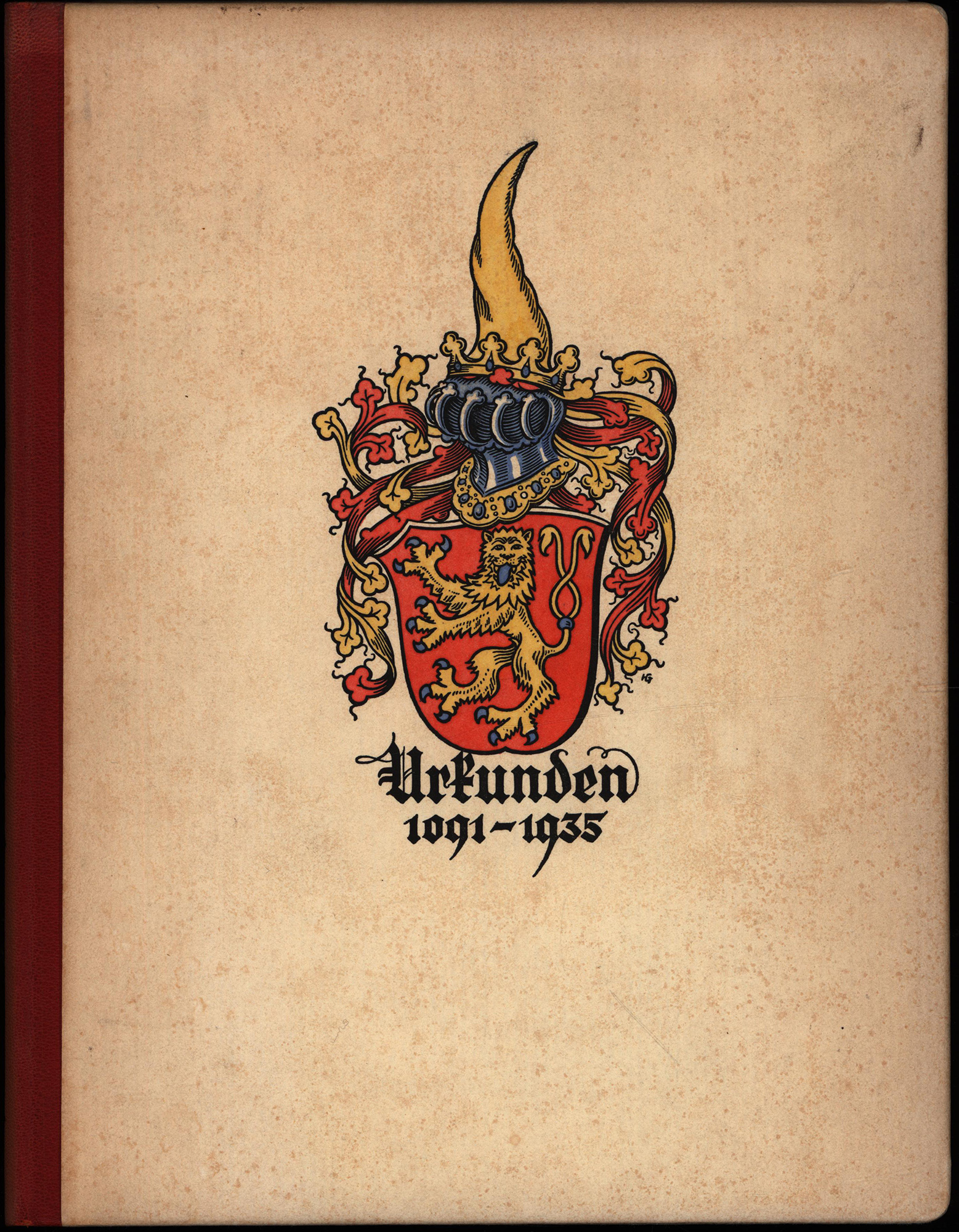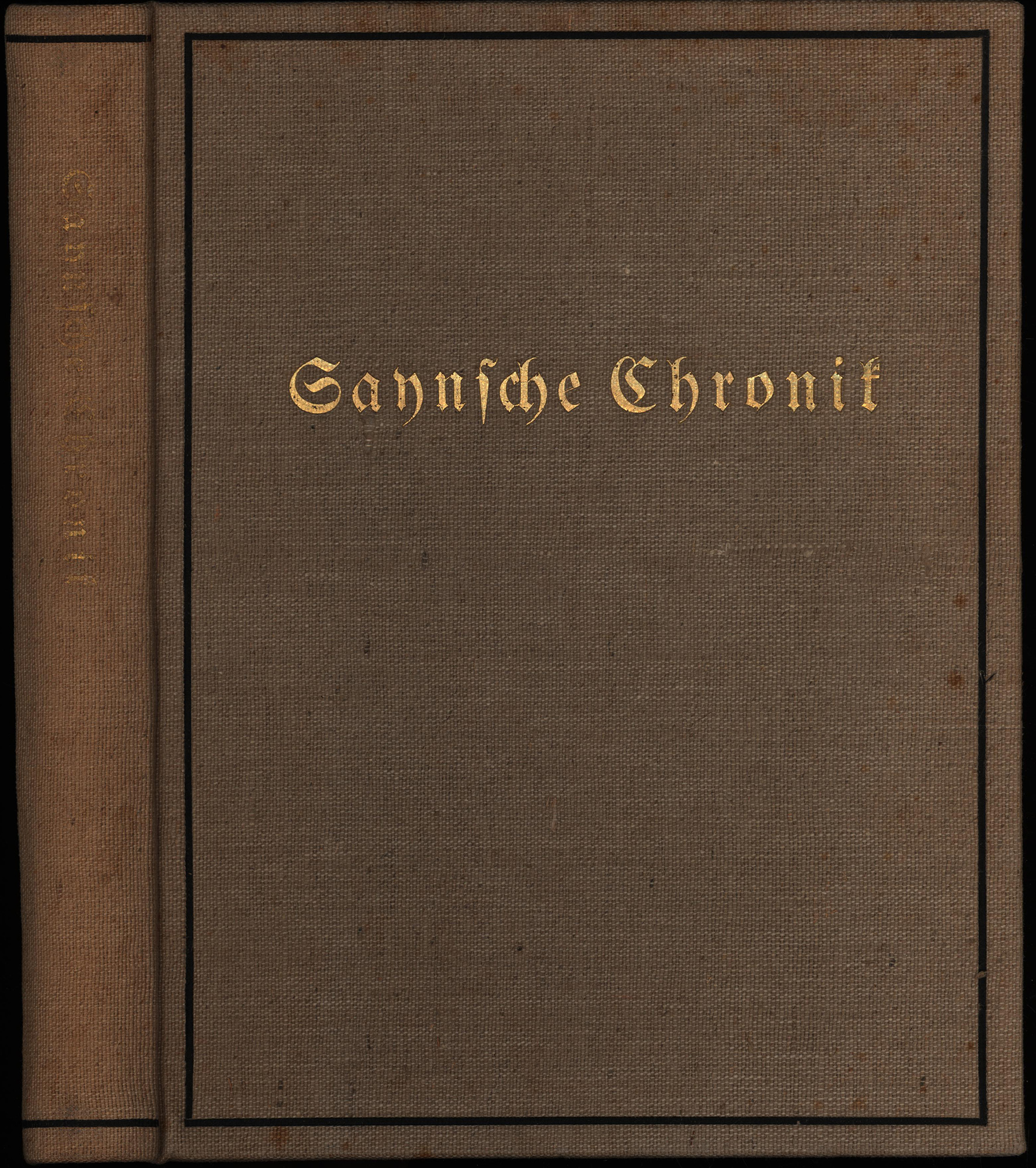 Hachenburg, Alexander von: Saynsche Chronik. 2 Bände (komplett). [Signierte Ausgabe]. Bonn/Bremen, Verlag Ludwig Röhrscheid/Walter Dorn, 1929/1936. 4°. 30 x 24 cm. XIX, 236; XVI, 305 Seiten. Original-Leinenband mit goldgeprägtem Rücken- und Deckeltitel und Original-Halblederband mit goldgeprägtem Rückentitel, farbiger Deckelillustration und Kopfgoldschnitt.