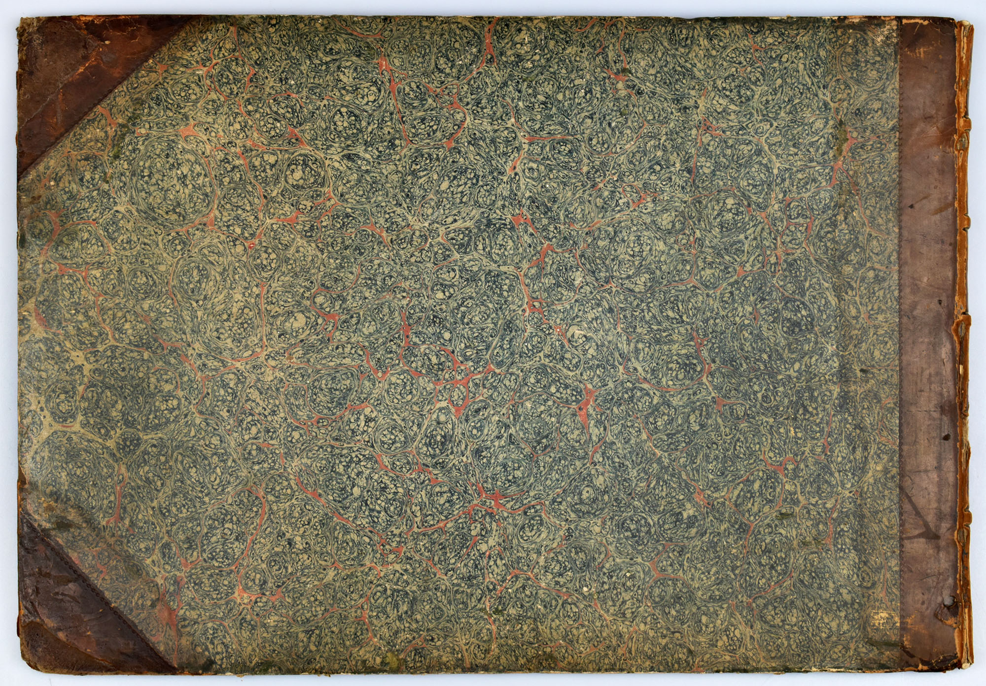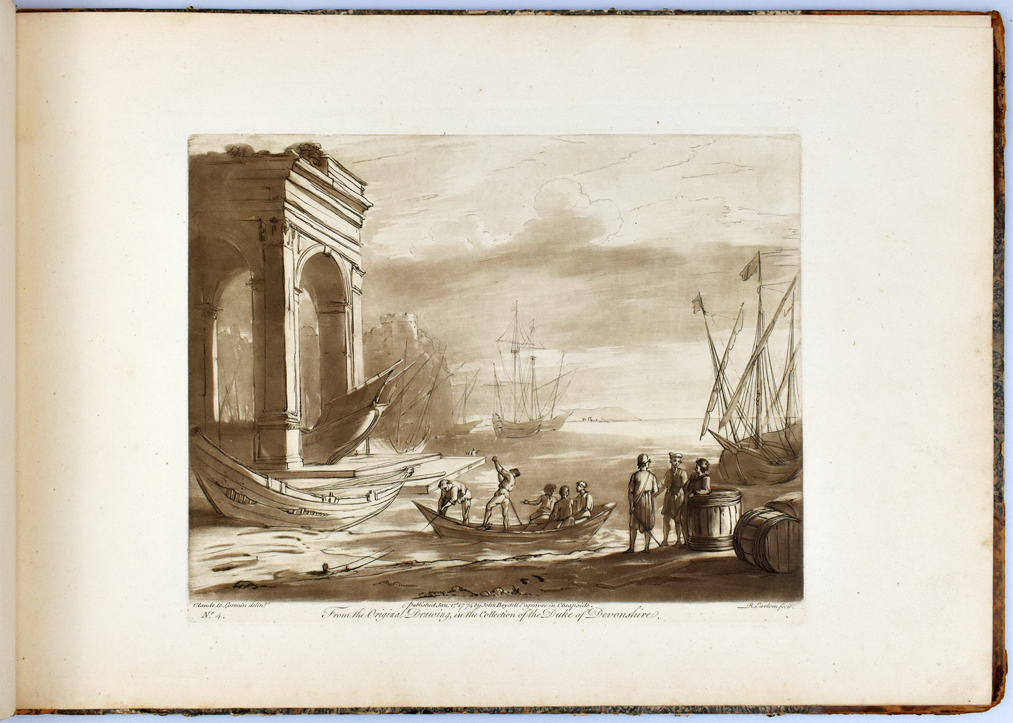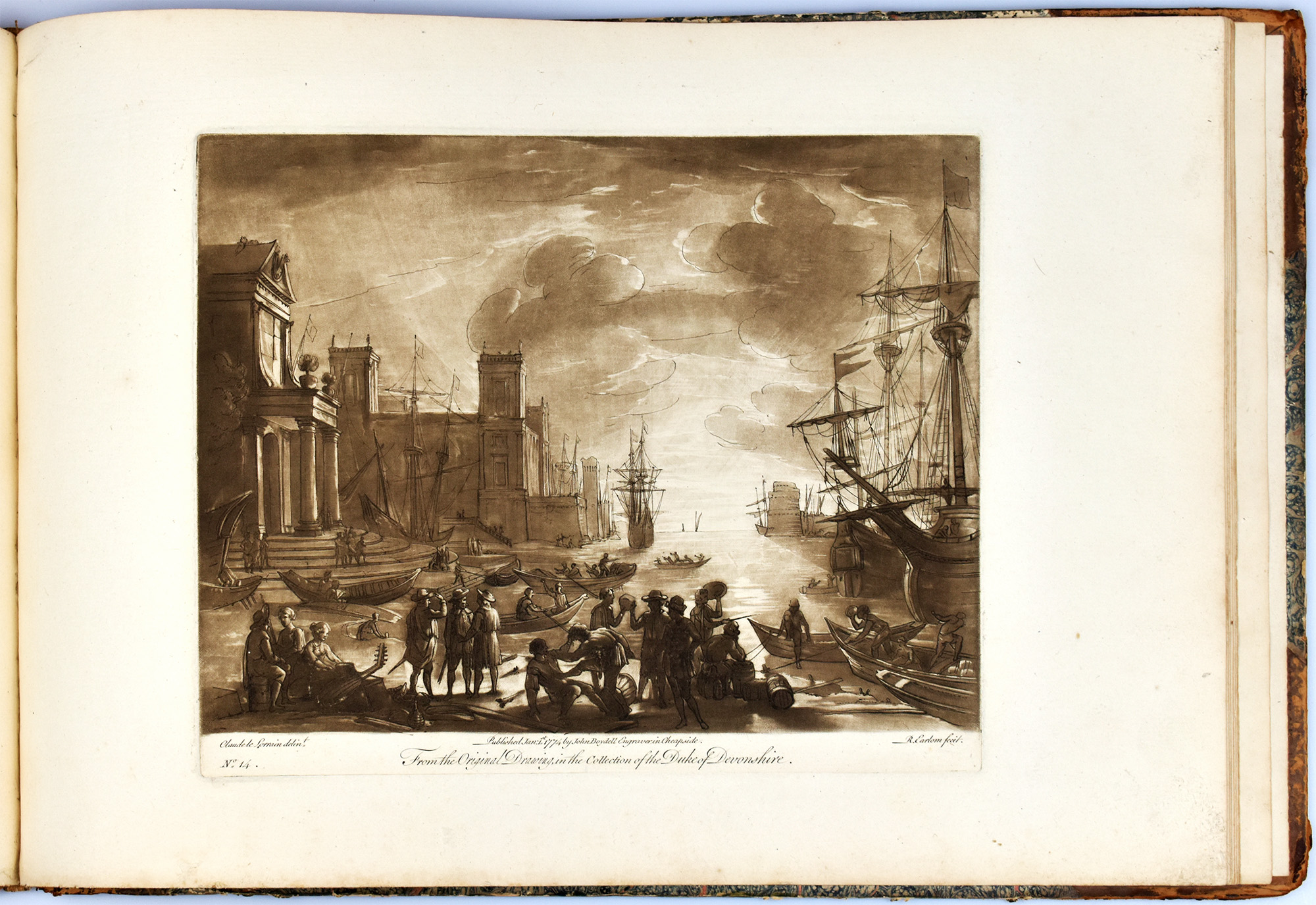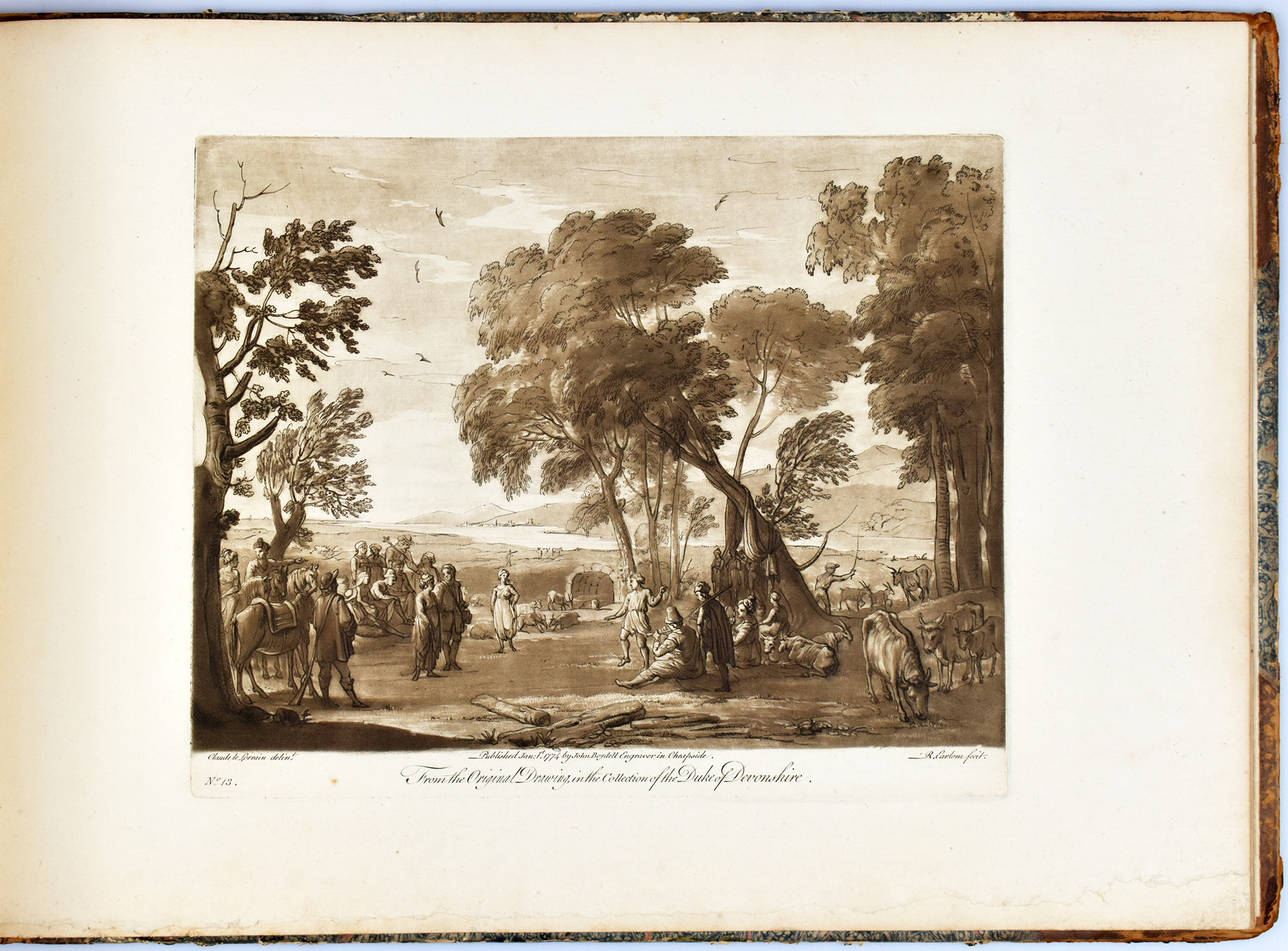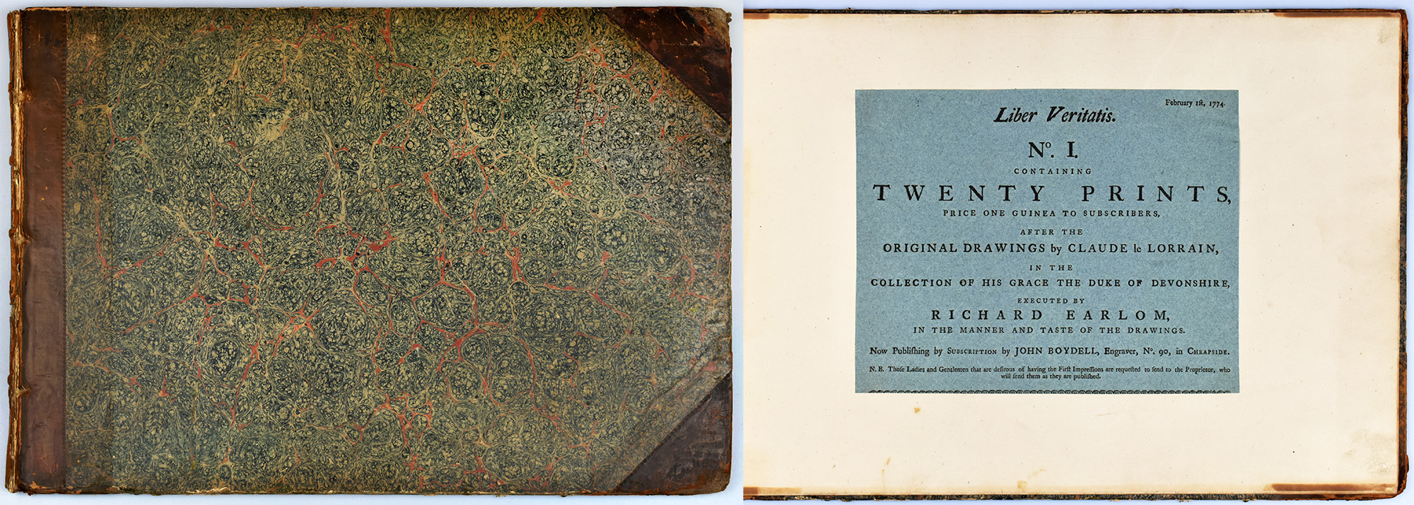 Earlom, Richard: Liber Veritatis No. 1. Containing twenty prints, after the original drawings by Claude le Lorrain, in the collection of his grace the Duke of Devonshire, executed by Richard Earlom, in the manner and taste of the drawings. Cheapside, verlegt durch John Boydell, 1774. Quer-2°. 29,5 x 43 cm. [1] Blatt. 20 Tafeln. Halblederband der Zeit mit marmoriertem Deckelbezug. Teil der Original-Broschur als Titelblatt verwendet.