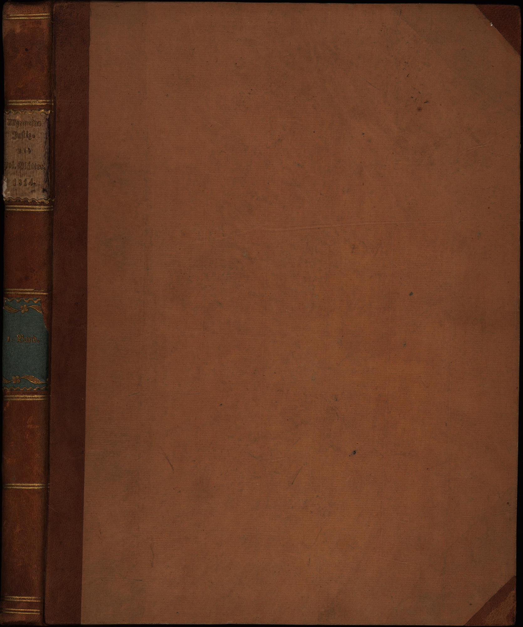 Hartleben, Theodor (Hrsg.): Allgemeine Justiz- und Polizei Blätter. Erster Band 1814. Pforzheim, gedruckt bei Johann Michael Katz, 1814. 4°. 25 x 20 cm. [2] Blatt, 286 Seiten. Halblederband der Zeit mit goldgeprägtem Titel auf Lederrückenschildchen und Rundum-Goldschnitt.
