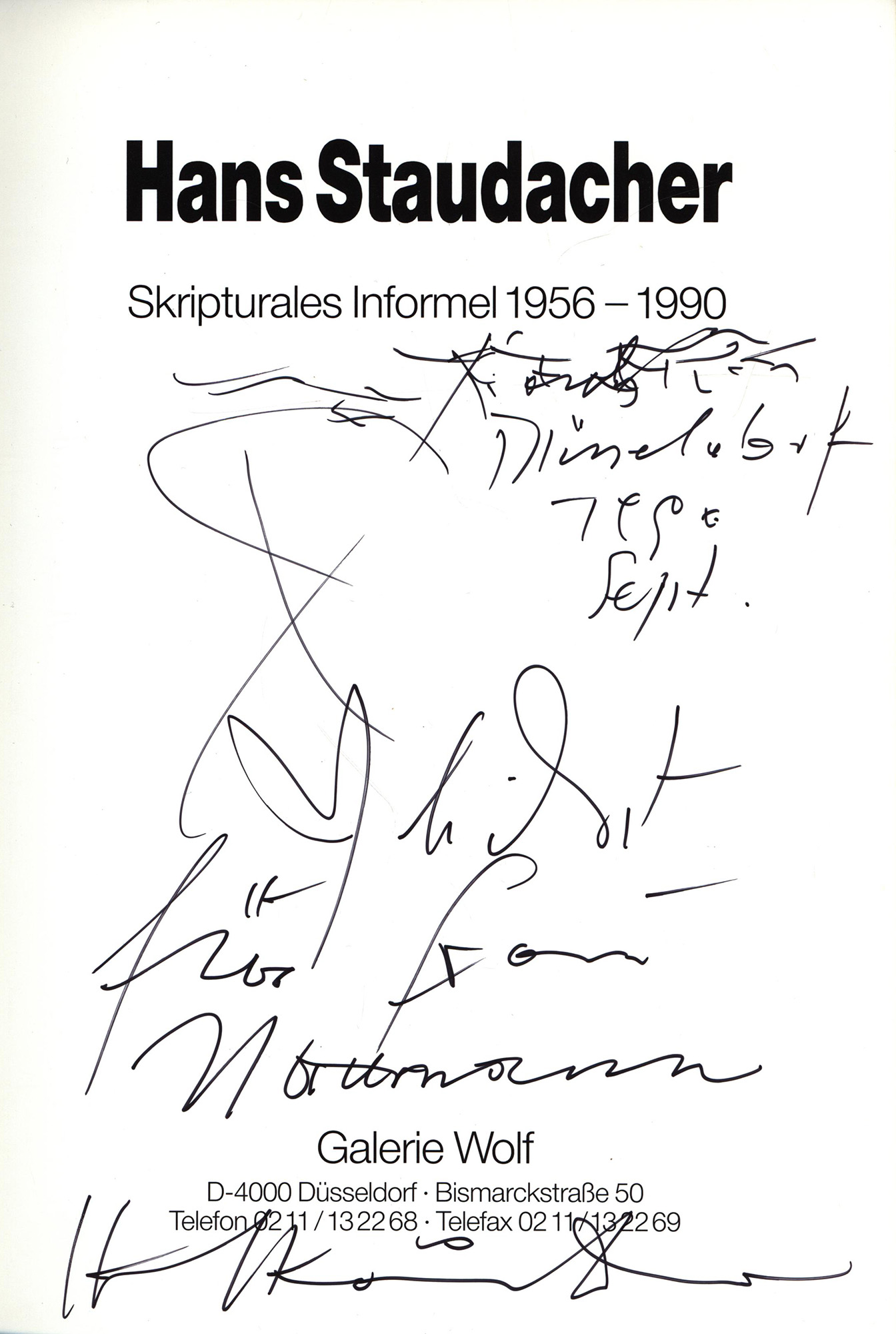 Staudacher, Hans: Hans Staudacher. Skripturales Informel 1956-1990. [Signiertes Widmungsexemplar]. Düsseldorf, Selbstverlag der Galerie Wolf, 1990. 4°. 28 x 20 cm. [34] Seiten. Original-Broschur.