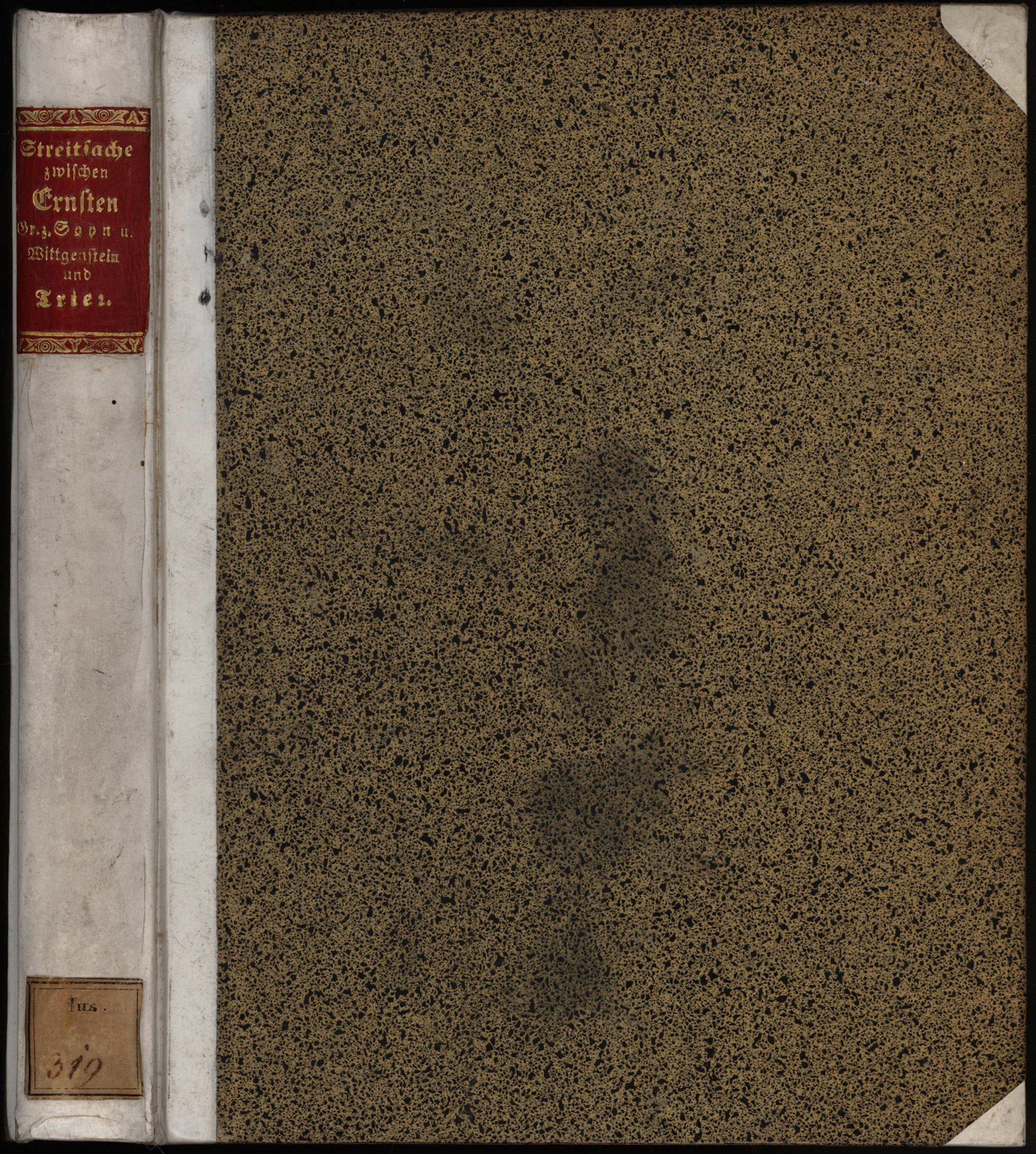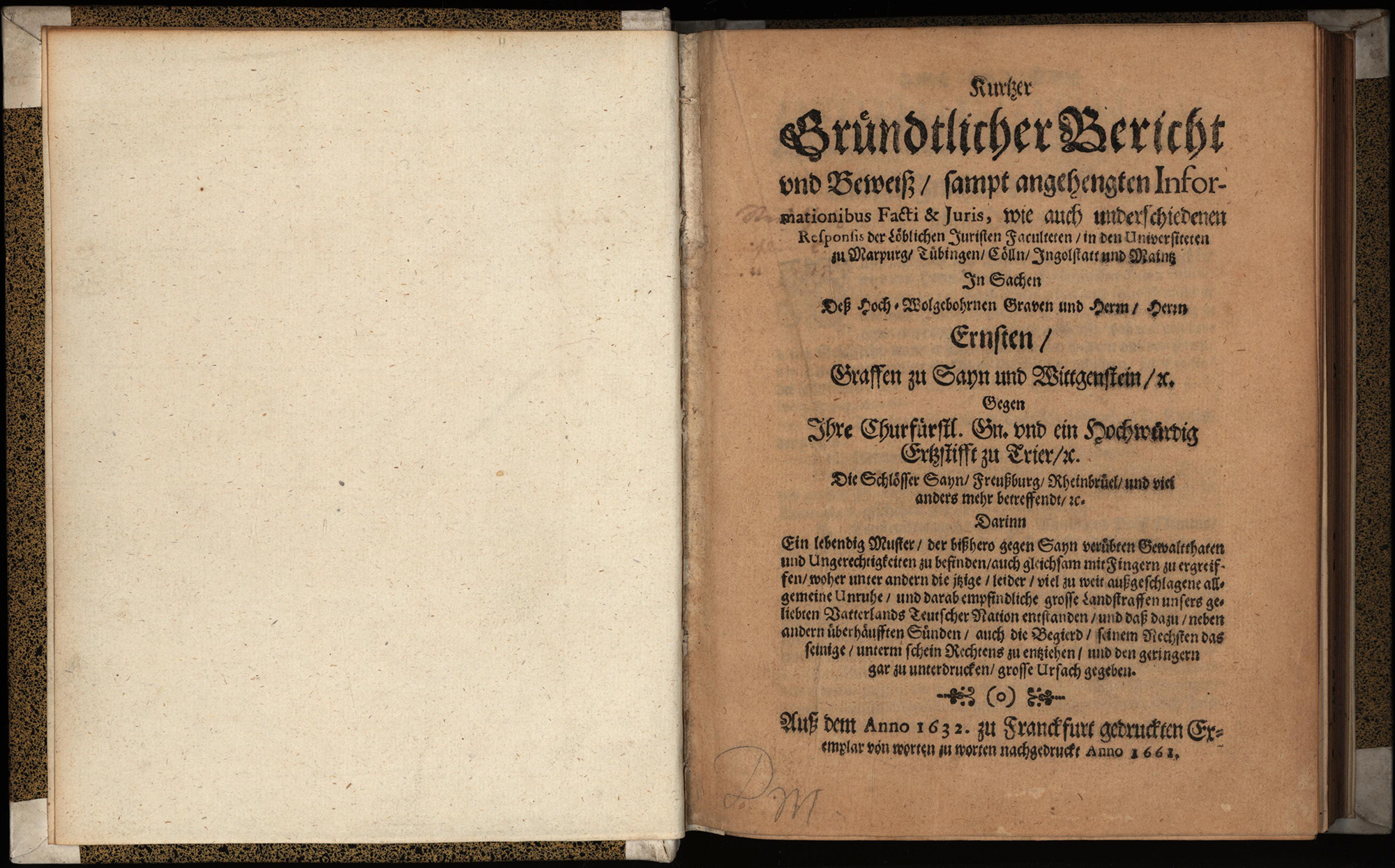 Kurtzer Gründtlicher Bericht und Beweiß, sampt angehengten Informationibus Facti & Juris, wie auch underschiedenen Responsis der Löblichen Juristen Faculteten, in den Universiteten zu Marpurg, Tübingen, Cölln, Ingolstatt und Maintz In Sachen Deß […] Herrn Ernsten, Graffen zu Sayn und Wittgenstein […] Gegen Ihre Churfürstl. Gn. und ein […] Ertzstifft zu Trier […] und viel anders mehr betreffendt etc. Auß dem Anno 1632 zu Franckfurt gedruckten Exemplar von worten zu worten nachgedruckt. S.l., 1661. 4°. 19,5 x 16 cm. [5] Blatt, 230 Seiten. 1 Stammtafel. Pappband späterer Zeit mit marmoriertem Deckelbezug und goldgeprägtem Titel auf rotem Rückenschildchen.