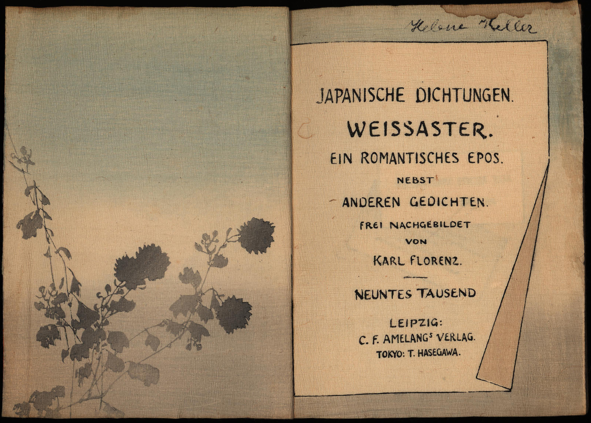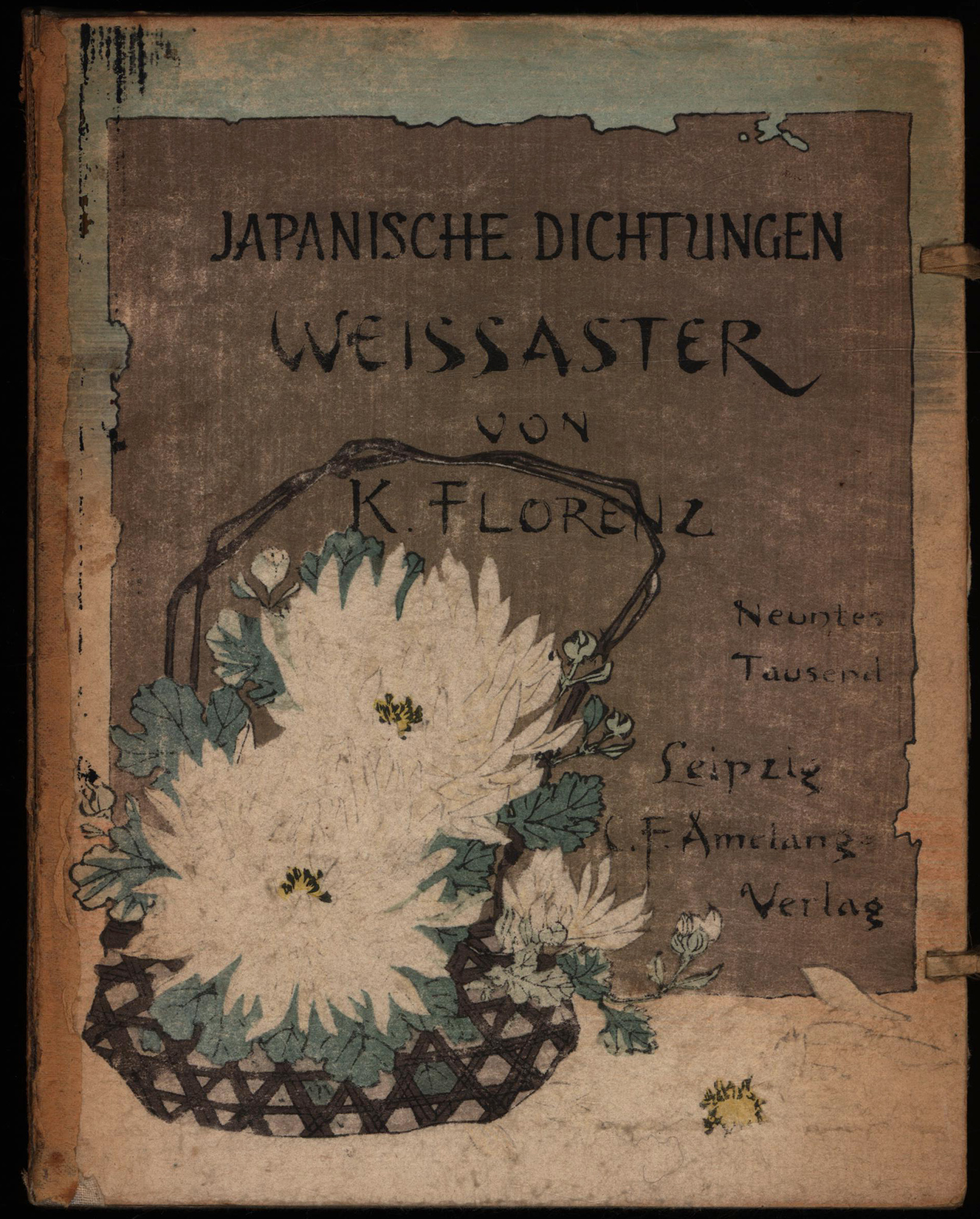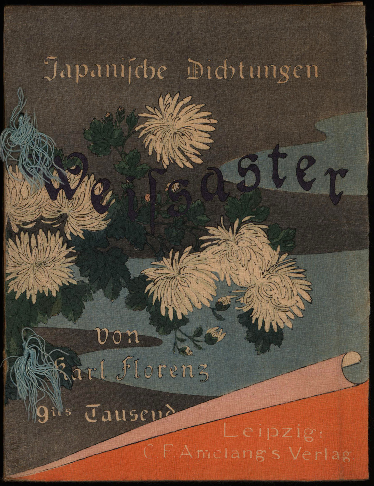 Florenz, Karl: Weissaster. Ein romantisches Epos. Nebst anderen Gedichten. Frei nachgebildet. Leipzig/Tokio, Amelang Verlag/Hasegawa Verlag, 1910 [Meiji 43]. 8°. 19 x 15 cm. 79 Seiten, 4 Blatt. Original-Broschur mit Seidenrücken in Blockbuchbindung. Original-Pappmappe. (= Japanische Dichtungen).