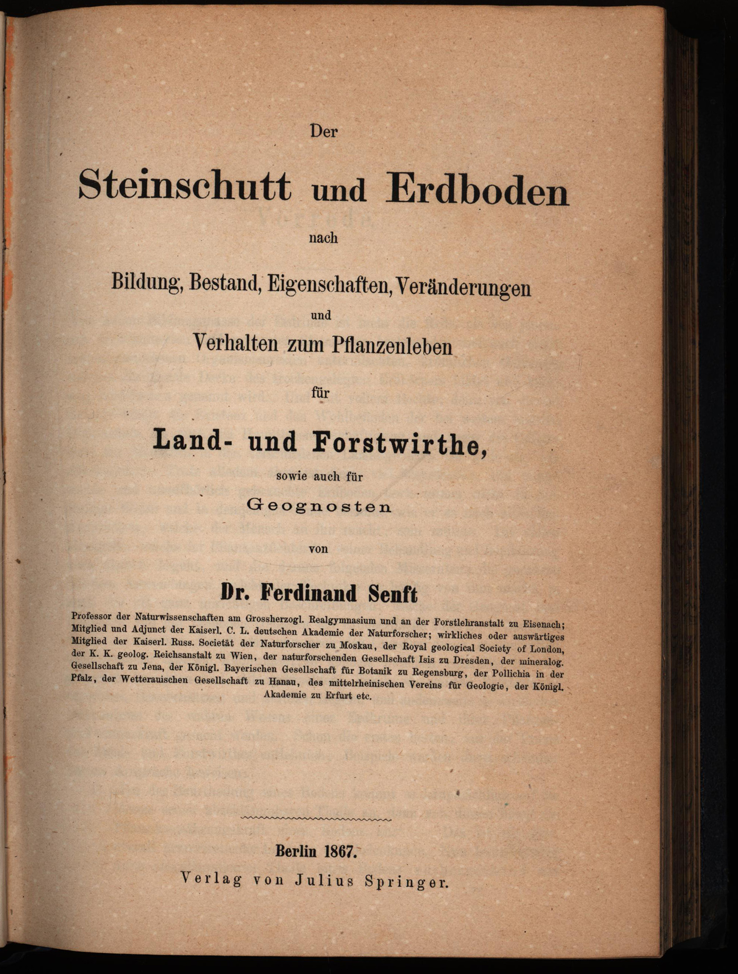 Senft, Ferdinand: Der Steinschutt und Erdboden nach Bildung, Bestand, Eigenschaften, Veränderungen und Verhalten zum Pflanzenleben für Land- und Forstwirthe, sowie auch für Geognosten. Berlin, Verlag Julius Springer, 1867. 8°. 22,5 x 16 cm. XIX, 366 Seiten. Halblederband der Zeit mit Gold- und Blindprägung am Rücken und marmoriertem Schnitt.