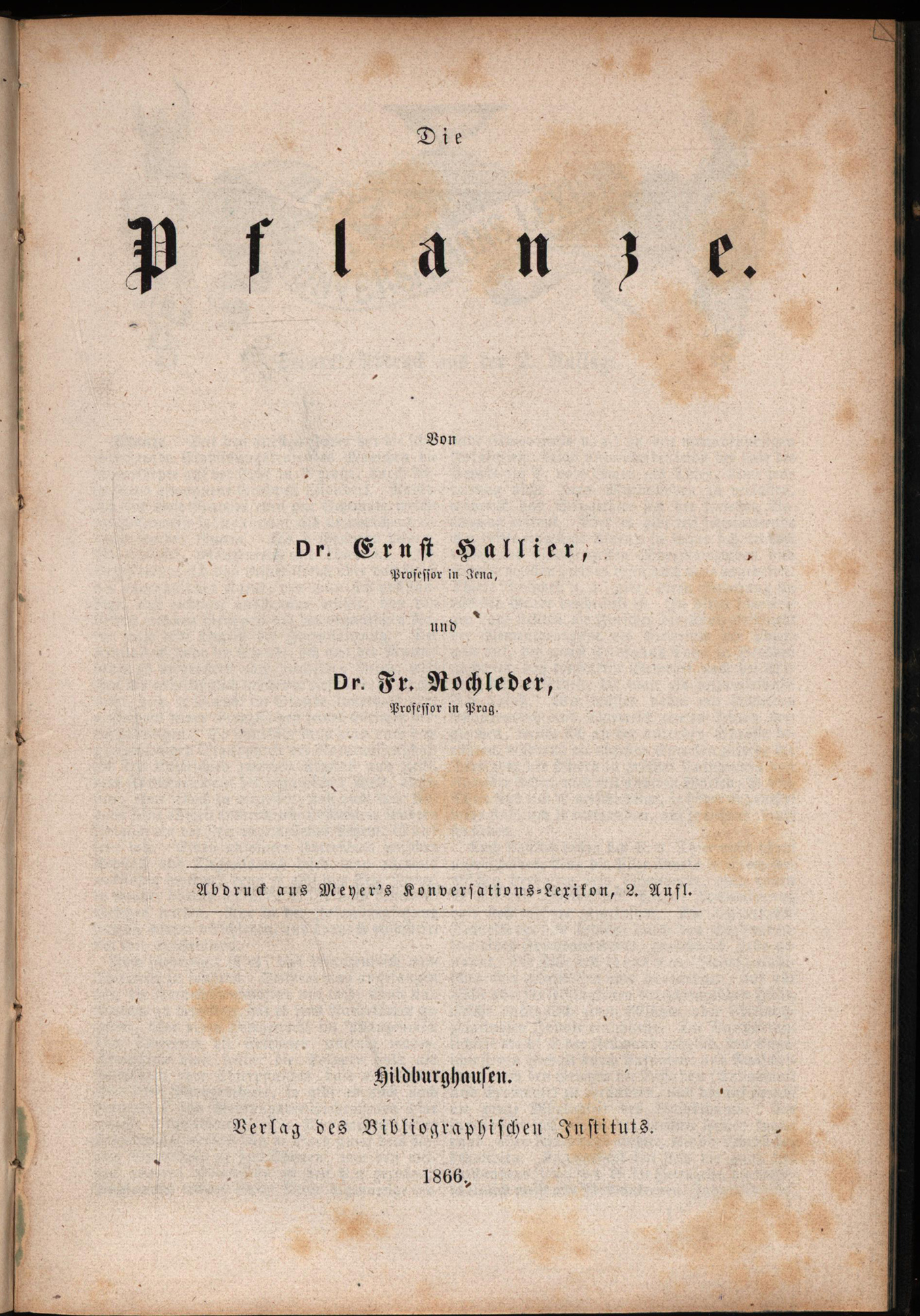 Hallier, Ernst und Rochleder, Fr.: Die Pflanze. Hildburghausen, Verlag des Bibliographischen Instituts, 1866. Groß-8°. 23 x 16 cm. 44 Seiten. Halbleinenband der Zeit.