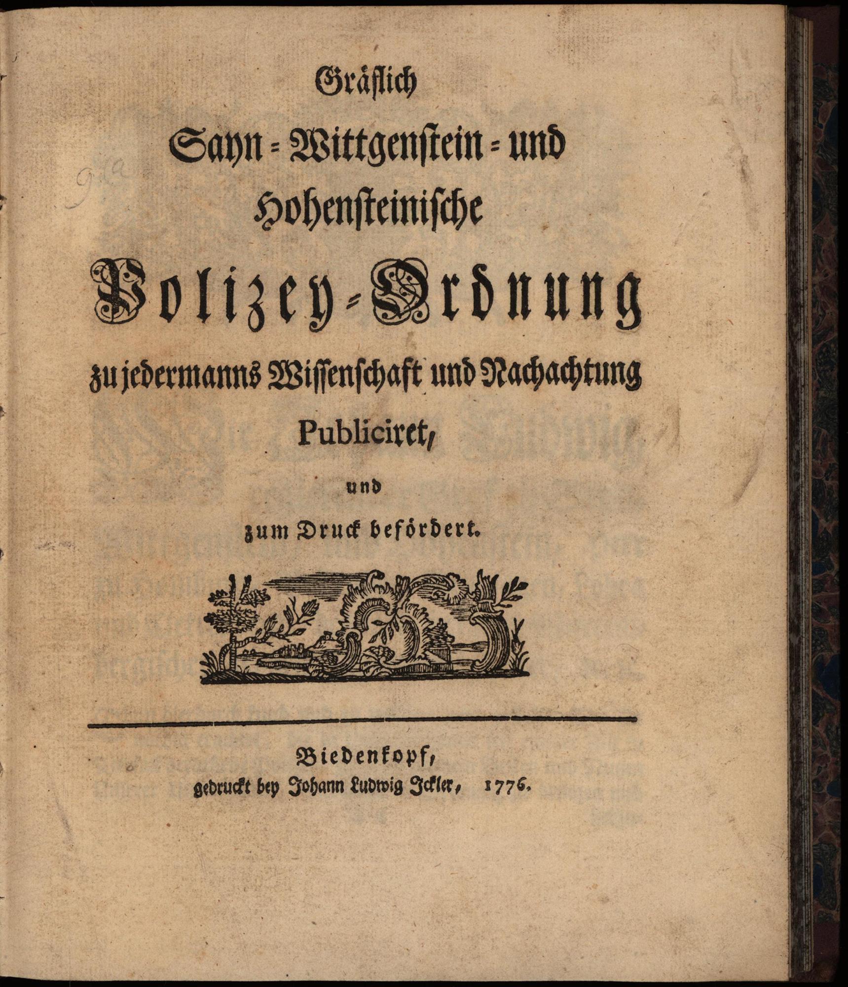 Gräflich Sayn-Wittgenstein- und Hohensteinische Polizey-Ordnung zu jedermanns Wissenschaft und Nachachtung Publiciret, und zum Druck befördert. Biedenkopf, gedruckt bey Johann Ludwig Ickler, 1776. 8°. 22 x 18 cm. 109 Seiten, [1] Blatt. Halbleinenband der Zeit mit marmoriertem Deckelbezug und marmoriertem Schnitt.