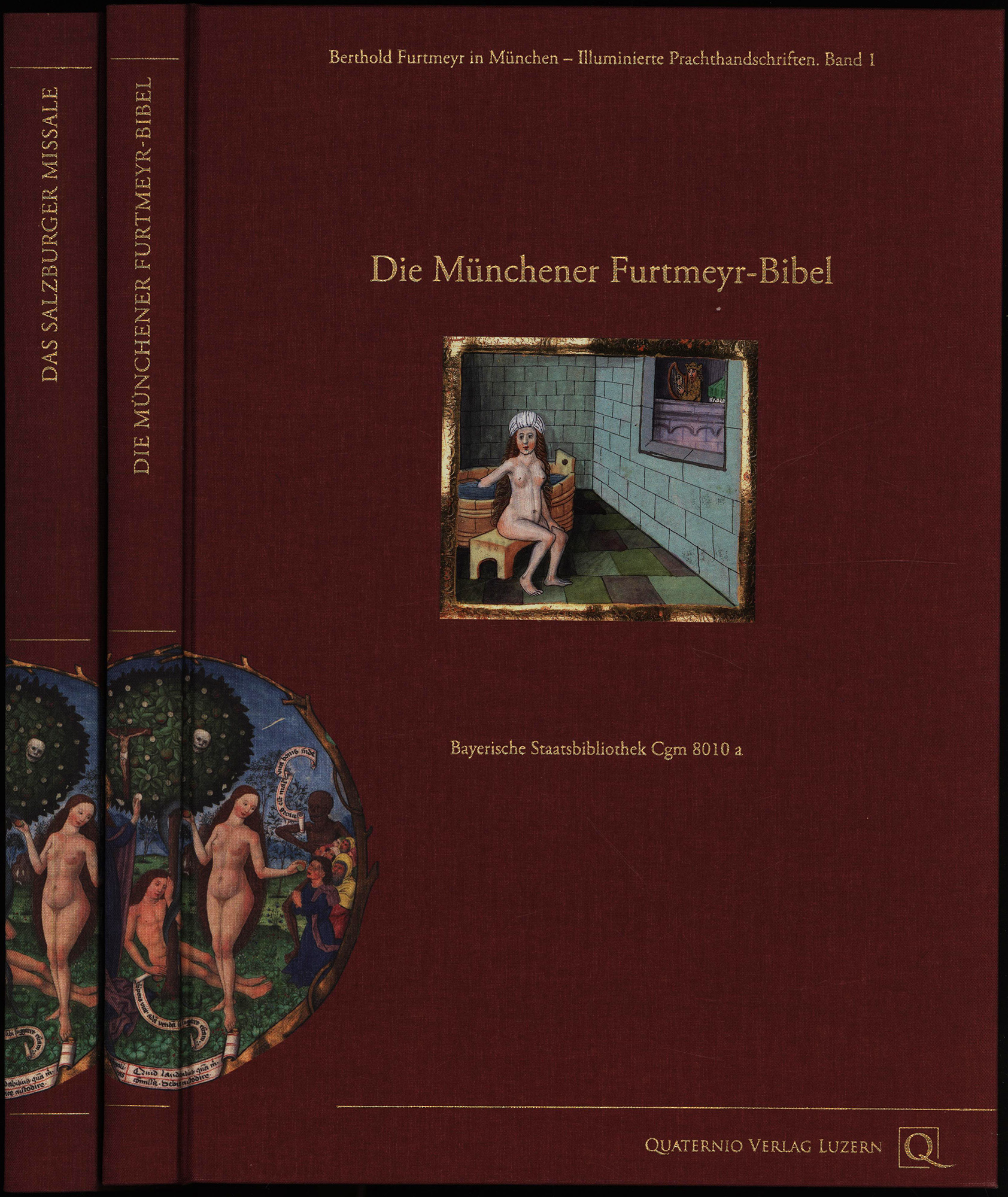 Fabian, Claudia; Bubenik, Claudia: Berthold Furtmeyr in München – Illuminierte Prachthandschriften. Herausgegeben von der Bayerischen Staatsbibliothek. Redaktion: Claudia Bubenik. 1. Band: Die Münchner Furtmeyr-Bibel. Bayerische Staatsbibliothek Cgm 8010a. Abbildungen aller Miniaturen aus der Handschrift mit einer Einführung und Beschreibung von Beatrice Hernad. 2. Band: Das Salzburger Missale. Bayerische Staatsbibliothek Clm 15708-15712. Abbildungen aller Miniaturen aus der Handschrift mit einer Einführung und Beschreibung von Karl-Georg Pfändtner. 2 Bände (komplett). Luzern, Quaternio Verlag, 2011. 4°. 33 x 24 cm. 175 und 207 Seiten. Illustrierte Original-Leinenbände mit goldgeprägtem Rücken- und Deckeltitel im illustrierten Original-Leinenschuber.