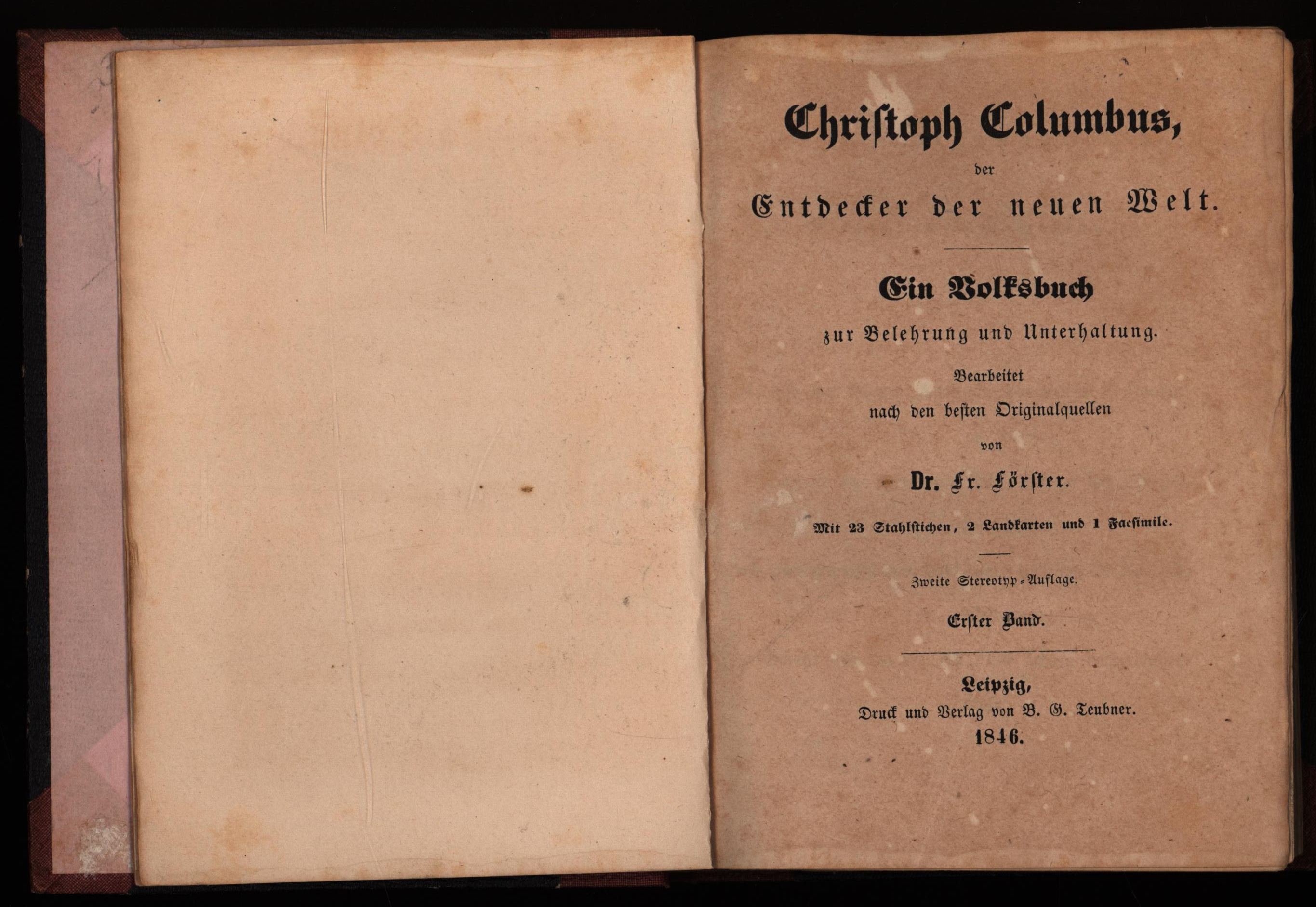 Förster, Friedrich Christoph: Christoph Columbus, der Entdecker der neuen Welt. Ein Volksbuch zur Belehrung und Unterhaltung. Mit 23 Stahlstichen, 2 Landkarten und 1 Facsimile. 3 Bände (= komplett). Leipzig, Teubner Verlag, 1846. Klein-8°. 15,5 x 12 cm. [2] Blatt, 384 Seiten; 388 Seiten; 375 Seiten, [2] Blatt.
