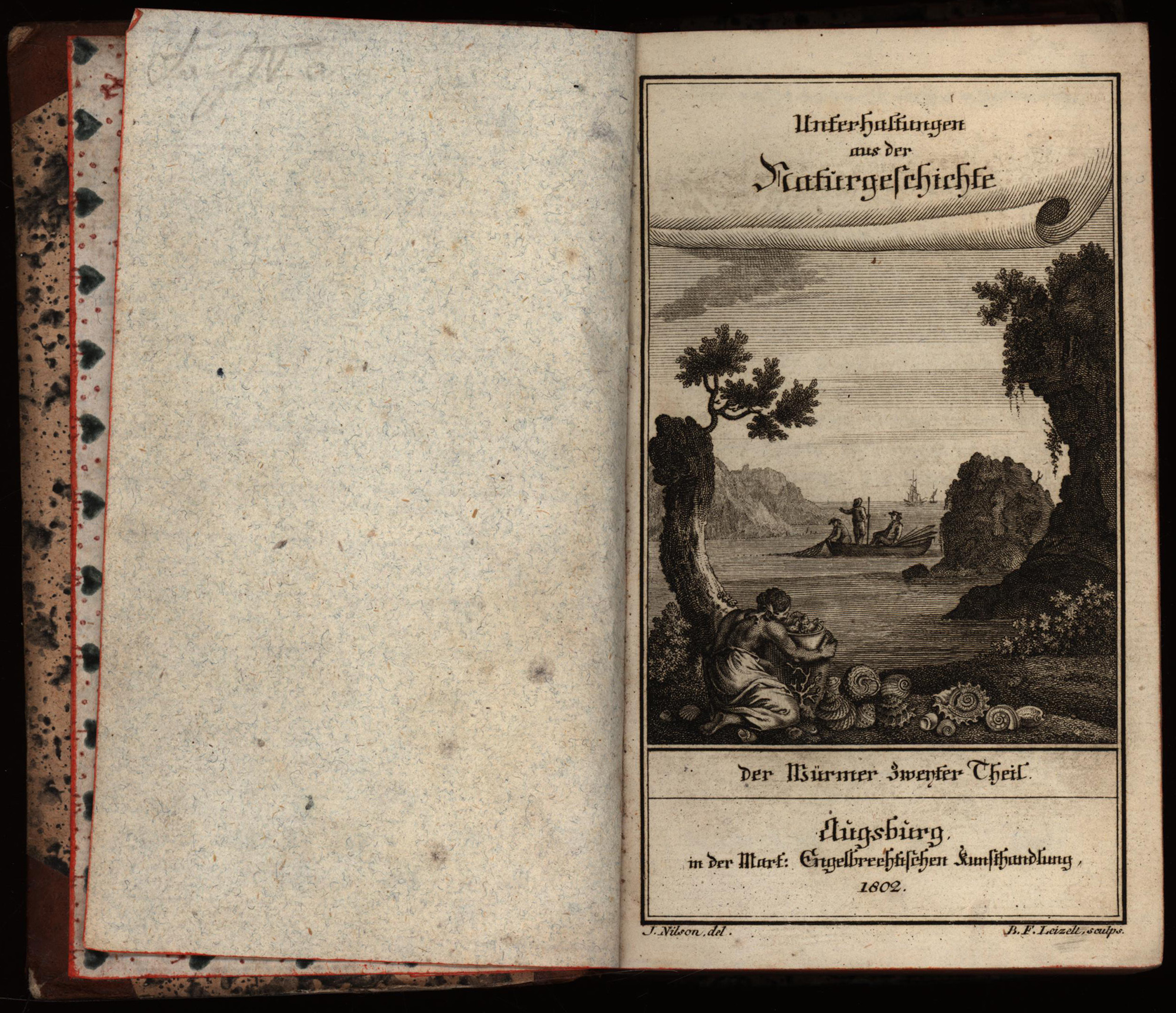 Wilhelm, Gottlieb Tobias: Unterhaltungen aus der Naturgeschichte. Der Würmer zweiter Theil. Band 2 (von 2). Augsburg, Verlag der Engelbrechtischen Buchhandlung [Engelbrecht], 1802. 8°. 17 x 11 cm. [3] Blatt, 468 Seiten, [10] Blatt. 56 Tafeln. Halblederband der Zeit auf 5 Bünden mit Rundum-Rotschnitt.