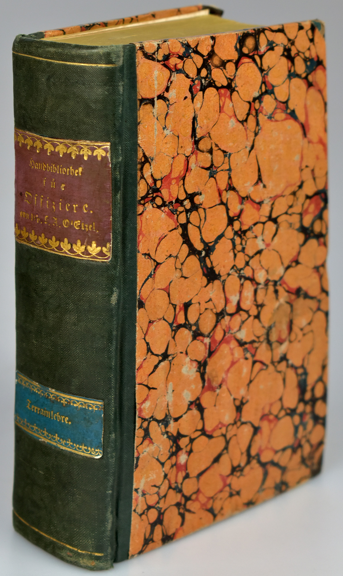 Etzel, Franz August von: Terrainlehre. Mit 9 Kupfertafeln. Berlin, Verlag Friedrich August Herbig, 1834. Klein-8°. 15,5 x 10 cm. XLIV, 472 Seiten. 9 Tafeln. Halbleinenband der Zeit mit goldgeprägten Rückentiteln auf blauem und violettem Rückenschildchen, marmoriertem Deckelbezug und Rundum-Goldschnitt. (= Handbibliothek für Offiziere oder Populaire Kriegslehre für Eingeweihte und Laien, Band 9).