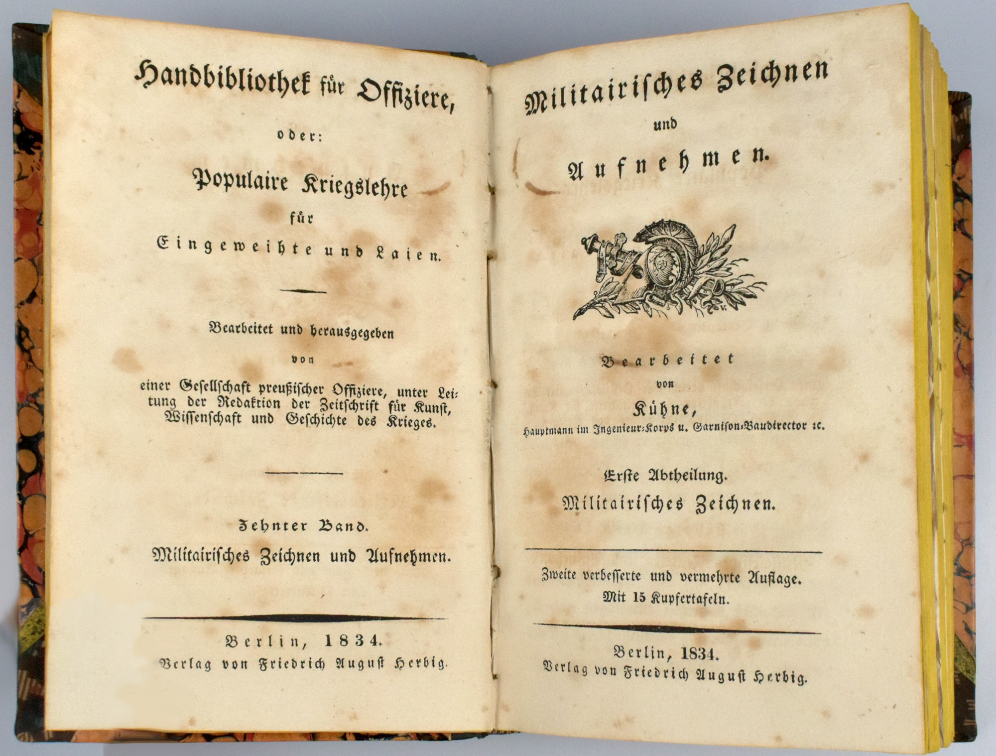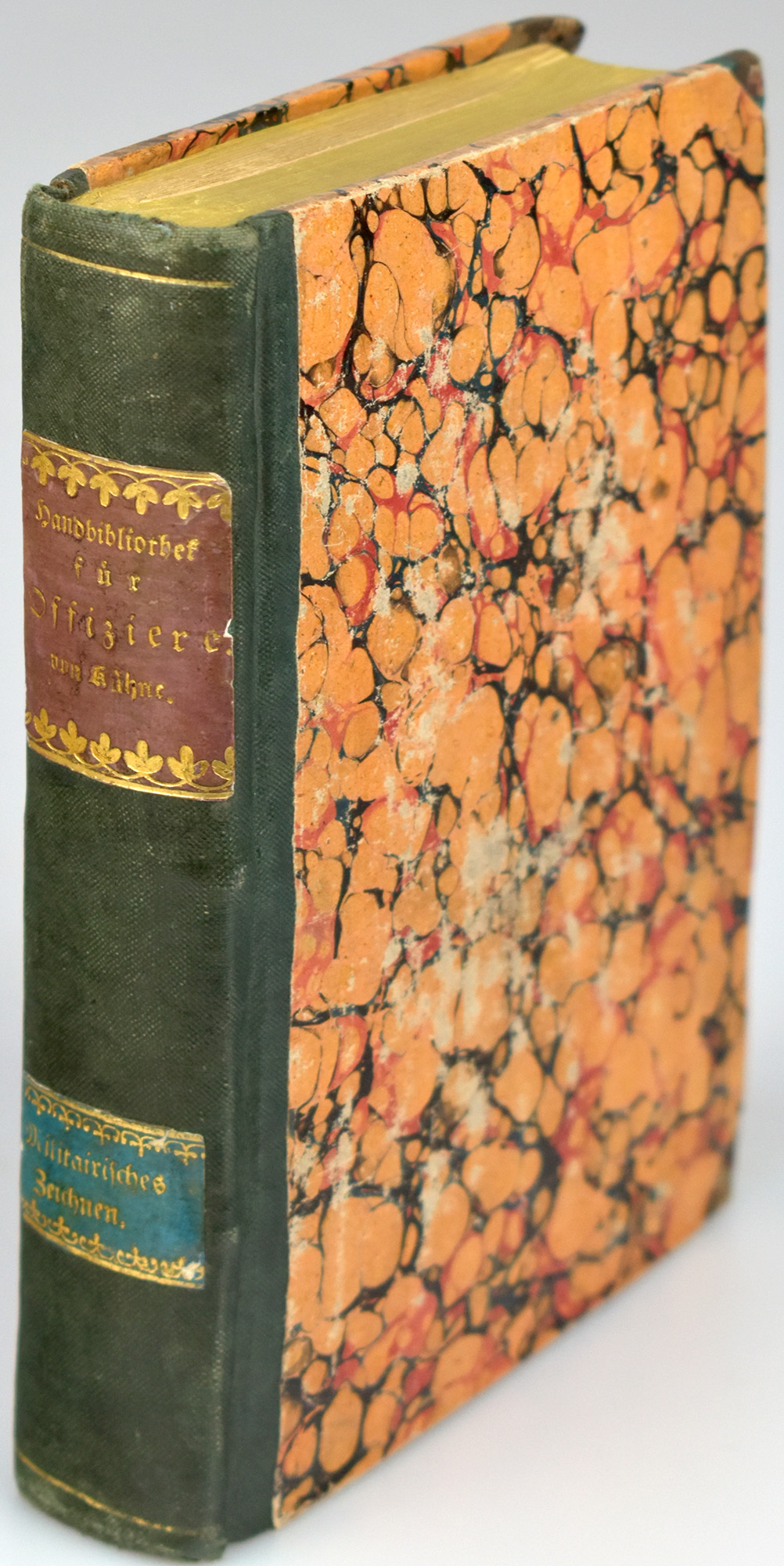 Kühne, K. (Bearb.): Militairisches Zeichnen und Aufnehmen. Mit 15 Kupfertafeln. Berlin, Verlag Friedrich August Herbig, 1834. Klein-8°. 15,5 x 10 cm. XVI, 245 Seiten, [1] Band. 15 Tafeln. Halbleinenband der Zeit mit goldgeprägten Rückentiteln auf blauem und violettem Rückenschildchen, marmoriertem Deckelbezug und Rundum-Goldschnitt. (= Handbibliothek für Offiziere oder Populaire Kriegslehre für Eingeweihte und Laien, Band 10).