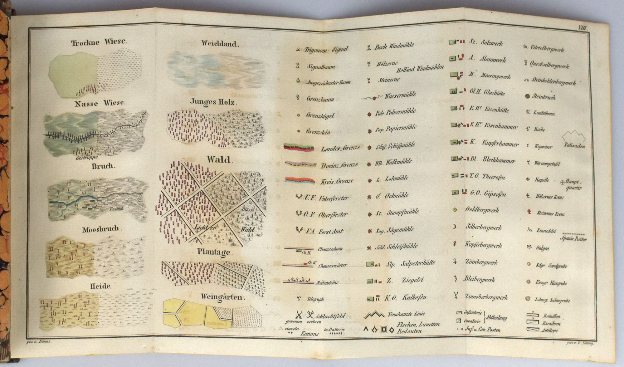 Half cloth binding with gilt spine titles on blue and violet leather labels, marbled paper boards, and gilt edges. Second, enlarged edition. With 9 engraved folding plates in the appendix, some partly hand-colored. Copy from the library of the Solms-Braunfels family (with their bookplate). Binding rubbed, corners somewhat bumped. Bookplate with offsetting. Double title slightly foxed, pages and plates only lightly foxed. Overall a near fine copy.