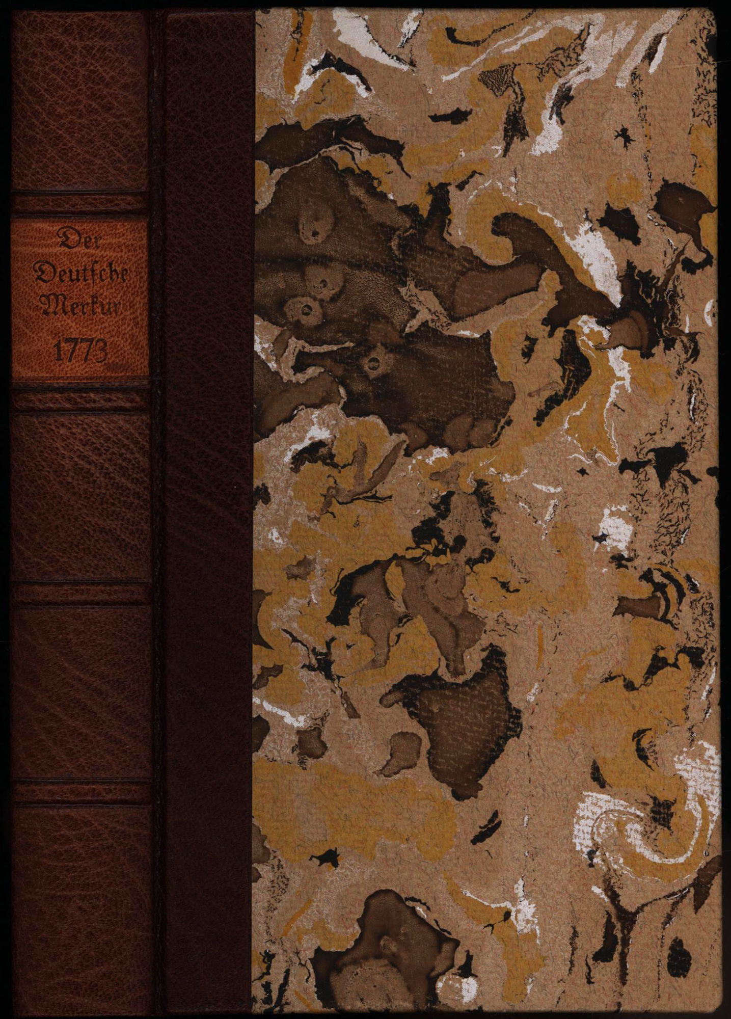 Wieland, Christoph Martin (Hrsg.): Der Deutsche Merkur. Des ersten Bandes erstes, zweytes [und] drittes Stück. 3 Teile (in 1 Band). Weimar, im Verlag der Gesellschaft, 1773. Klein-8°. 17,5 x 11 cm. 288 Seiten. Späterer Halblederband im Stile der Zeit auf 4 Bünden mit blindgeprägtem Rückenschild, marmoriertem Deckelbezug und Sprengschnitt. Im passenden Pappschuber mit Buntpapierbezug.