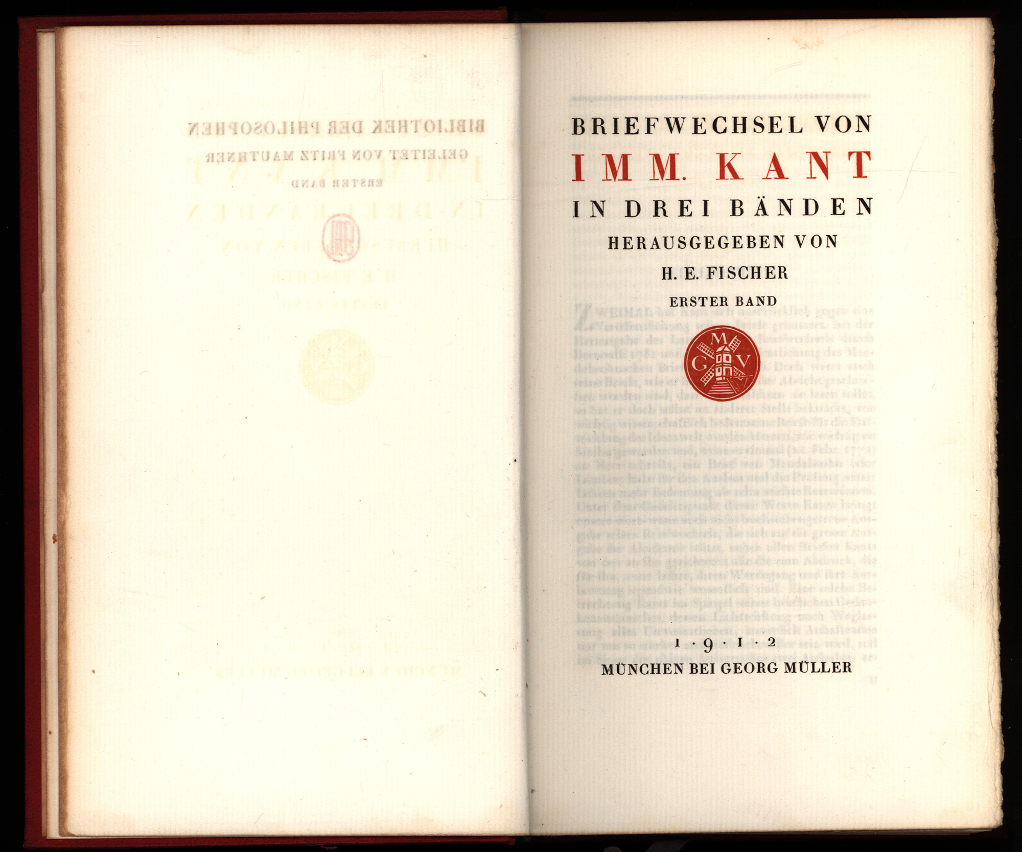 Kant, Immanuel – Fischer, H.E. (Hrsg.): Briefwechsel von Imm. Kant. München, Verlag Georg Müller, 1912-1913. Groß-8°. 23 x 15 cm. XV, 394 Seiten, [1] Blatt; [2] Blatt, 403 Seiten; [2] Blatt, 400 Seiten, [1] Blatt. Rote Original-Lederbände auf 5 Bünden mit floraler Rückenprägung, goldgeprägtem Titel auf schwarzem Lederrückenschild, goldenen Rücken- und Deckelfileten, Kopfgoldschnitt und zweiseitig rauem Schnitt. (= Bibliothek der Philosophen, Bände 1, 6, 7).