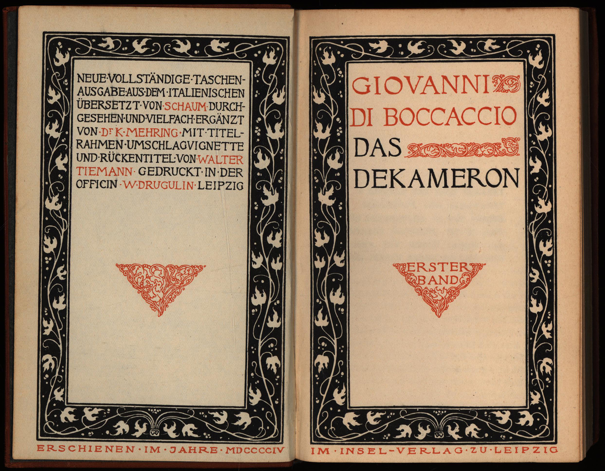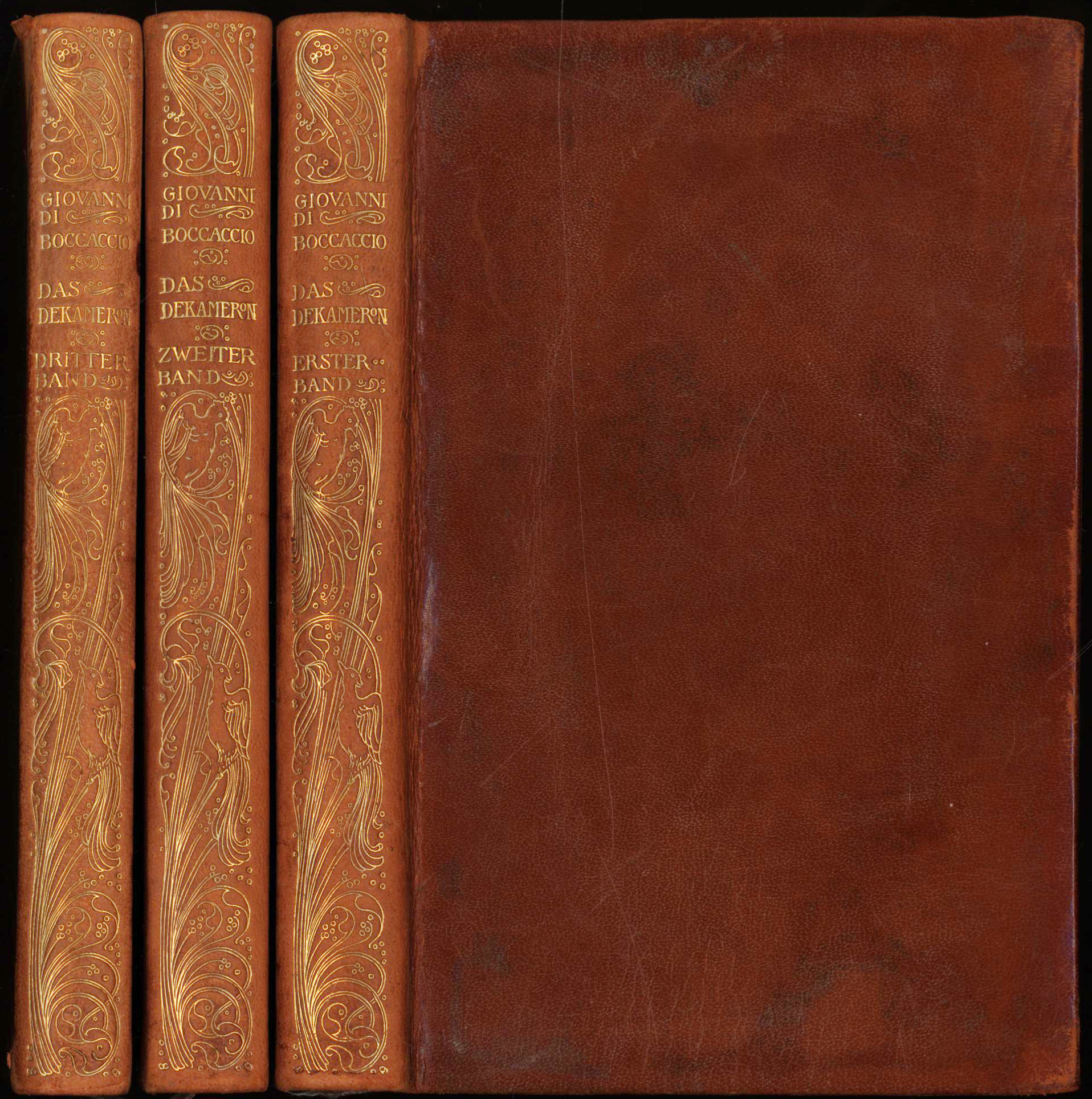 Boccaccio, Giovanni: Das Dekameron. 3 Bände (komplett). Vollständige Taschenausgabe. Aus dem Italienischen übersetzt von Schaum. Durchgesehen und vielfach ergänzt von K. Mehring. Leipzig, Insel Verlag, 1904. Klein-8°. 16 x 10,5 cm. 416; 395; 375 Seiten. Original-Lederbände mit goldgeprägtem Rückentitel und Kopfgoldschnitt.