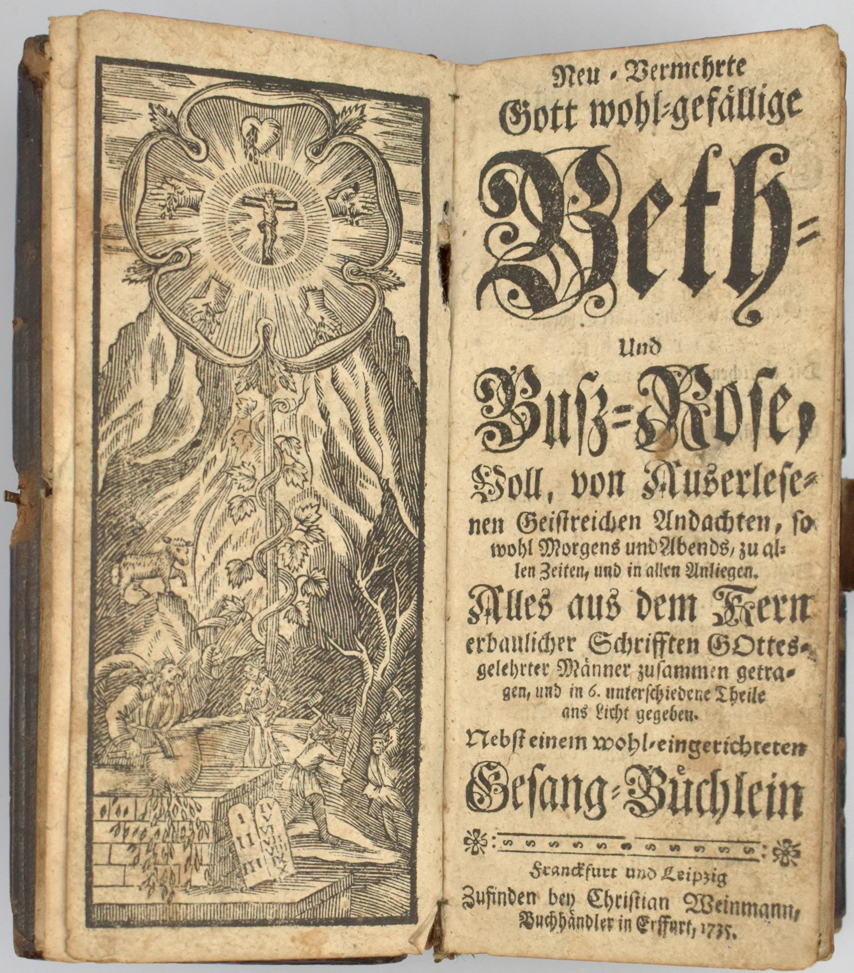 Neu-vermehrte Gott wohl-gefällige Beth- und Buß-Rose. Voll, von Außerlesenen Geistreichen Andachten, so wohl Morgens und Abends zu allen Zeiten, und in allen Anliegen. Alles aus dem Kern erbaulicher Schrifften Gottes-gelehrter Männer zusammen getragen, und in 6. unterschiedene Theile ans Licht gegeben. Nebst einem wohl-eingerichteten Gesang-Büchlein. Frankfurt und Leipzig, verlegt durch Christian Weinmann, 1735. Klein-8°. 16,5 x 7,5 cm. 385, 232 Seiten, [3] Blatt. Lederband der Zeit mit Lederriemenschließe mit Messingverschluss und gepunztem Rundum-Goldschnitt.