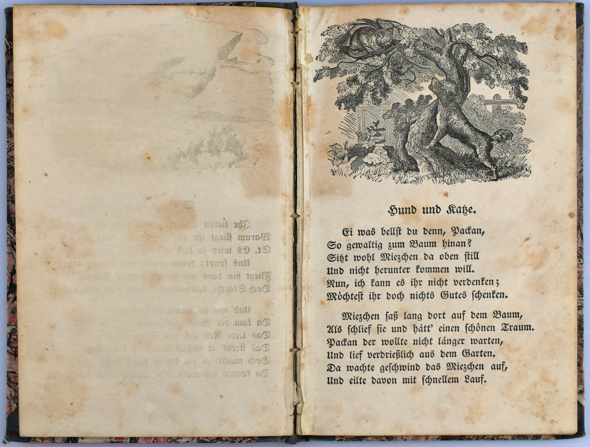 Hardcover of the time with marbled covers and yellow edges on all sides. Very early and presumably the first woodcut edition. cf. Klotz II, 2640/29 and 30; cf. Wegehaupt I, 924. With 50 woodcut illustrations after Speckter, each placed in the upper third of the page, with the fables in verse printed beneath. This edition does not fully correspond to any listed in the standard bibliographies. The volume itself also does not contain the note “New Edition.” Spine faded. Corners somewhat bumped. Tiny owner’s stamp on the title page and a small defect in the corner of the title page (approx. 3.5 × 1.5 cm). Some foxing throughout. A good copy with woodcuts preserved in beautiful, clear impressions.